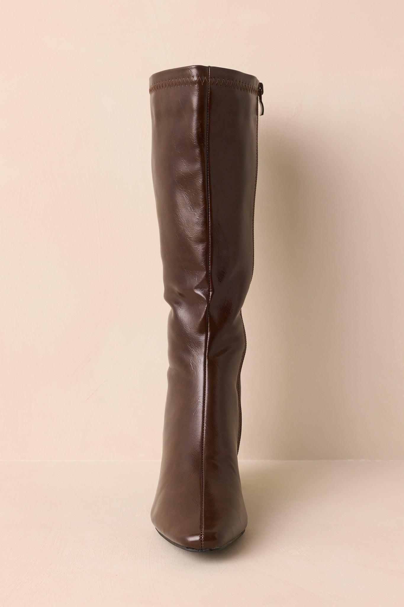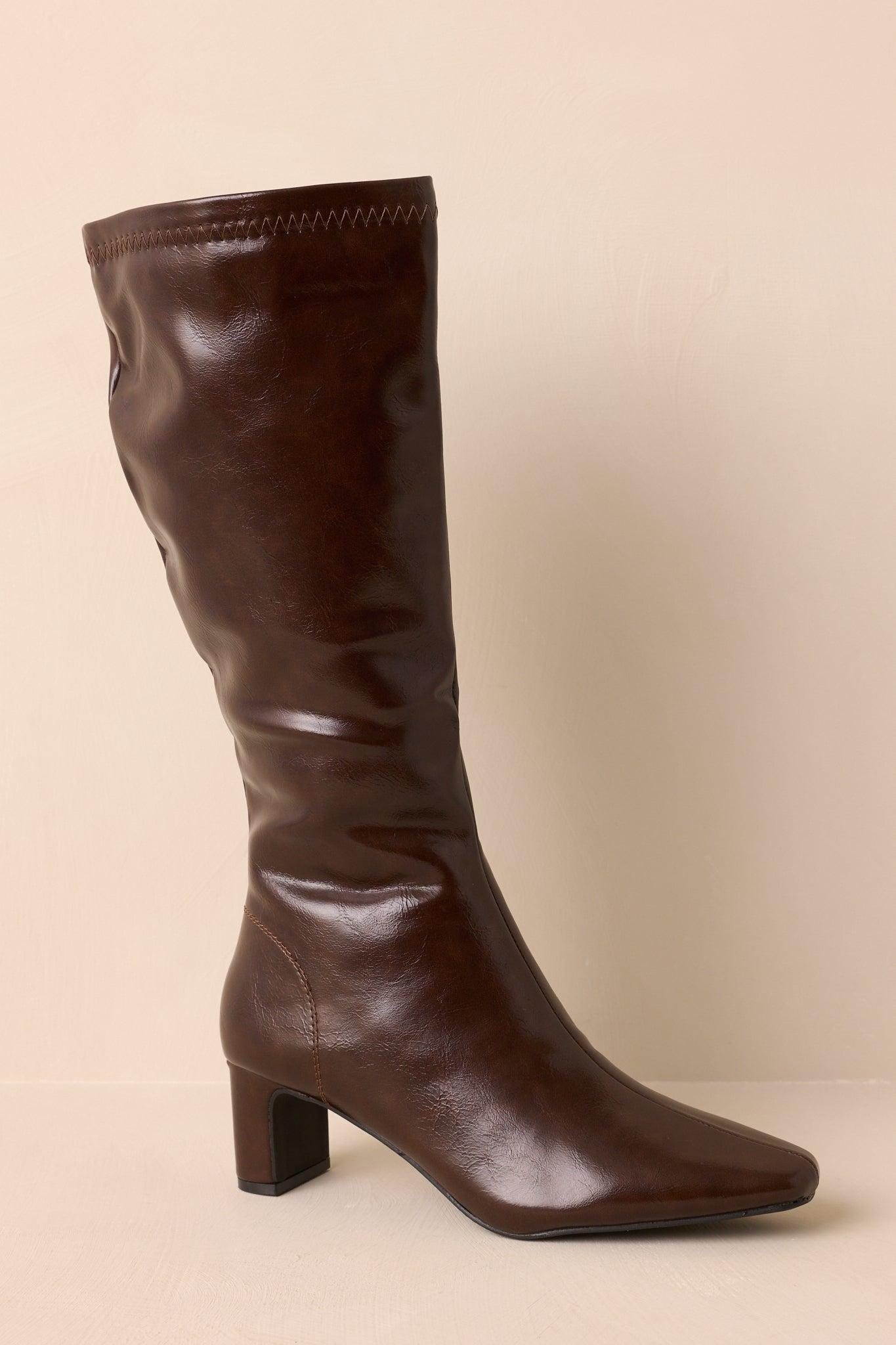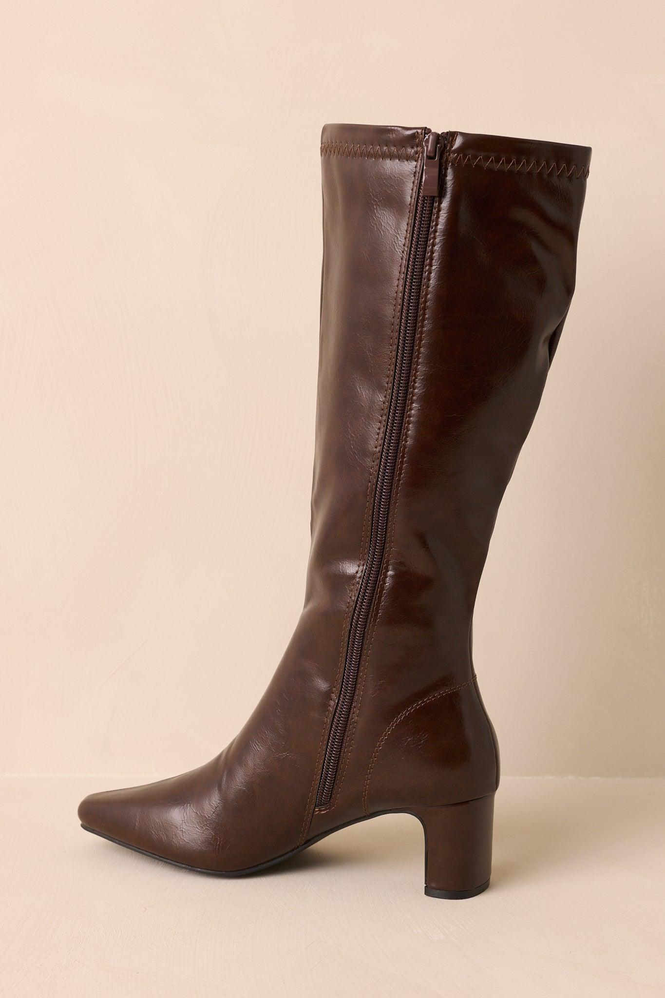 The Set The Tone Chocolate Brown Faux Leather Knee High Block Heel Boots establish the mood from the start, a statement of confidence that leads every look forward. These chocolate brown boots feature a faux leather material, a pointed toe, side zipper closure, block heel, and tonal topstitching details. Heel measures 2.25" Man made materials Non-skid sole Manufactured in China Designed in The USA True to Size, Wide Foot Friendly