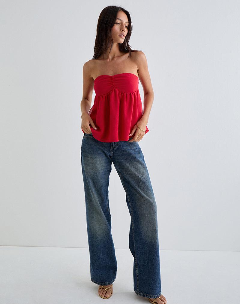 The Setsuko top in an red fabric base. Featuring a strapless design with subtle gathering at the centre front, complete with a flowy silhouette. Paired with our Parallel jeans in bright blue wash. MODEL WEARS SIZE: EXTRA SMALL - MODEL HEIGHT:5'7