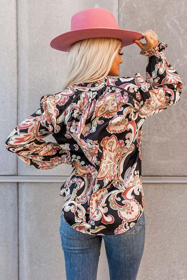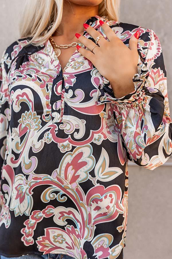 - You'll look simply stunning in this chic top! - Lightweight black material with a colorful abstract floral design - High ruffled neckline - Crochet details at the shoulders - Button down bodice - Long, loose, sleeves with ruffled cuffs - Relaxed silhouette that falls to a rounded hemline Measurements S : Bust 38", Hip 42", Length 23", Sleeve Length 23.5", Waist 40". M : Bust 40", Hip 44", Length 23.5", Sleeve Length 24", Waist 42". L : Bust 42", Hip 46", Length 24", Sleeve Length 24", Waist 44".