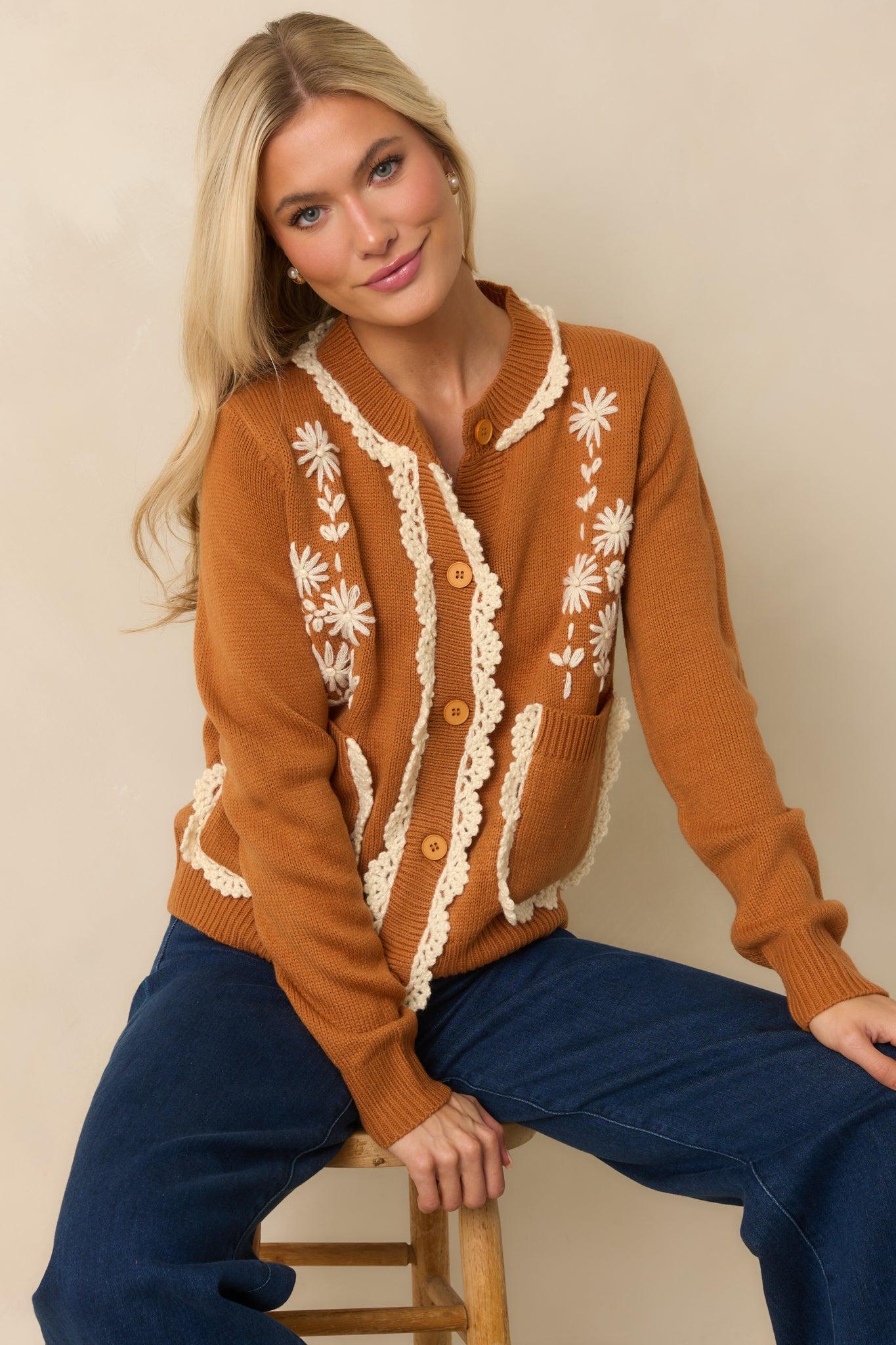 The Settling In Caramel Brown Floral Embroidered Button Front Cardigan feels warm and inviting, a charming layer made for easy moments and everyday comfort. This caramel brown cardigan sweater features an ivory daisy embroidered front, scalloped crochet trim along the neckline, placket, and functional patch pockets, a round neckline, functional button front closure, long sleeves, and ribbed hems. 100% Acrylic Unlined Hand Wash Cold Manufactured in China Designed in The USA Model is 5'8" and is Wearing a Size Small