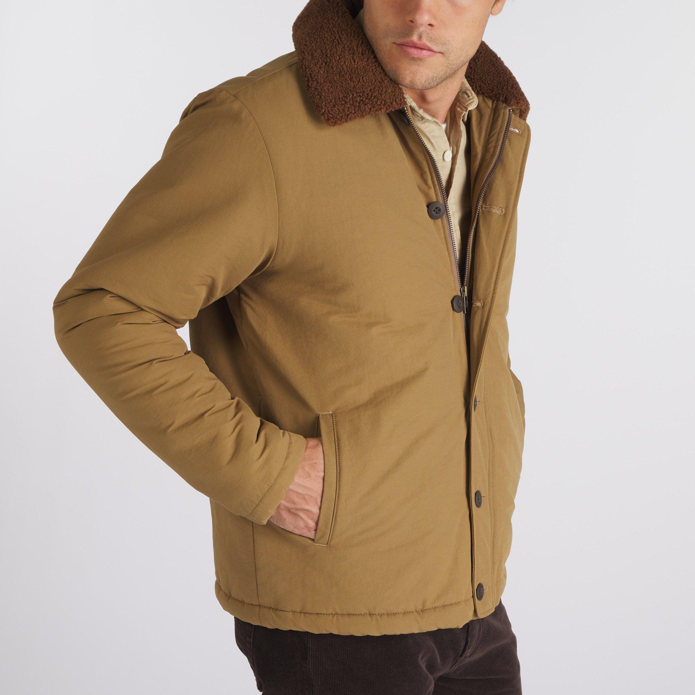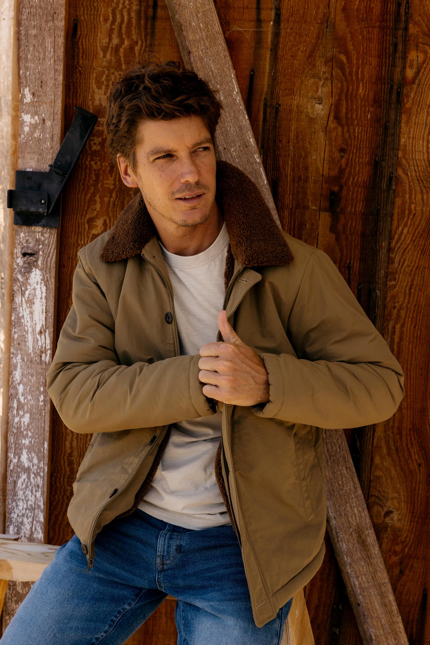 Introducing your ultimate ticket to cozy comfort, our cold-weather crusader! Inspired by the N1DC naval jackets, first introduced 1943, our version uses modern equivalents, with a sturdy cotton nylon shell and finished with a warm and plush sherpa lining. Featuring the combined zip-front closure and military styled button-through flap for extra protection. Side entry pockets and internal patch pockets. Wear it over a button down shirt or one of our chunky sweaters.