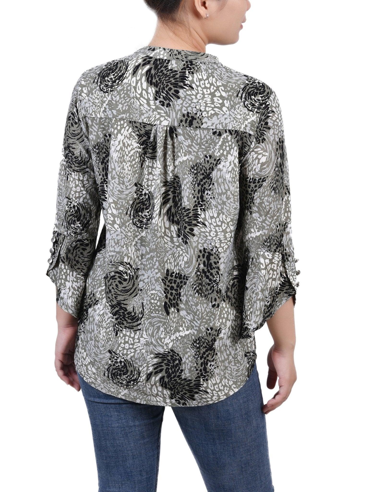 Shadow Black Animal 3/4 Sleeve Overlapped Bell Sleeve Y Neck Top - Petite