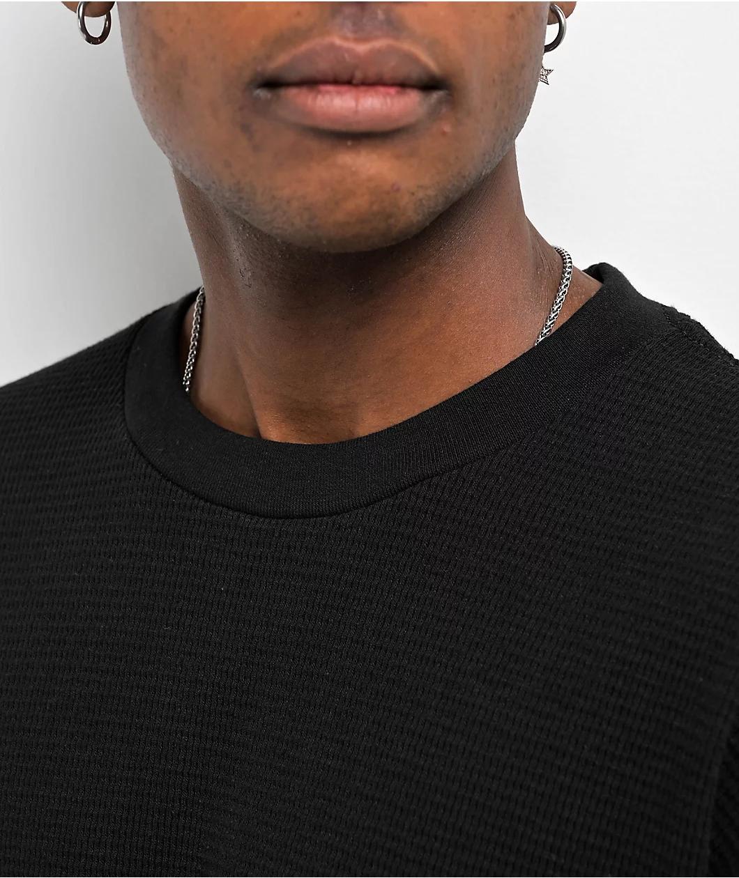 The black colorway of the Shaka Wear long sleeve thermal t-shirt is made using heavyweight 9 oz. fabric. With a loose silhouette and minimal branding, the waffle-knit long sleeve is finished off with ribbed sleeve cuffs and a flag label along the side.