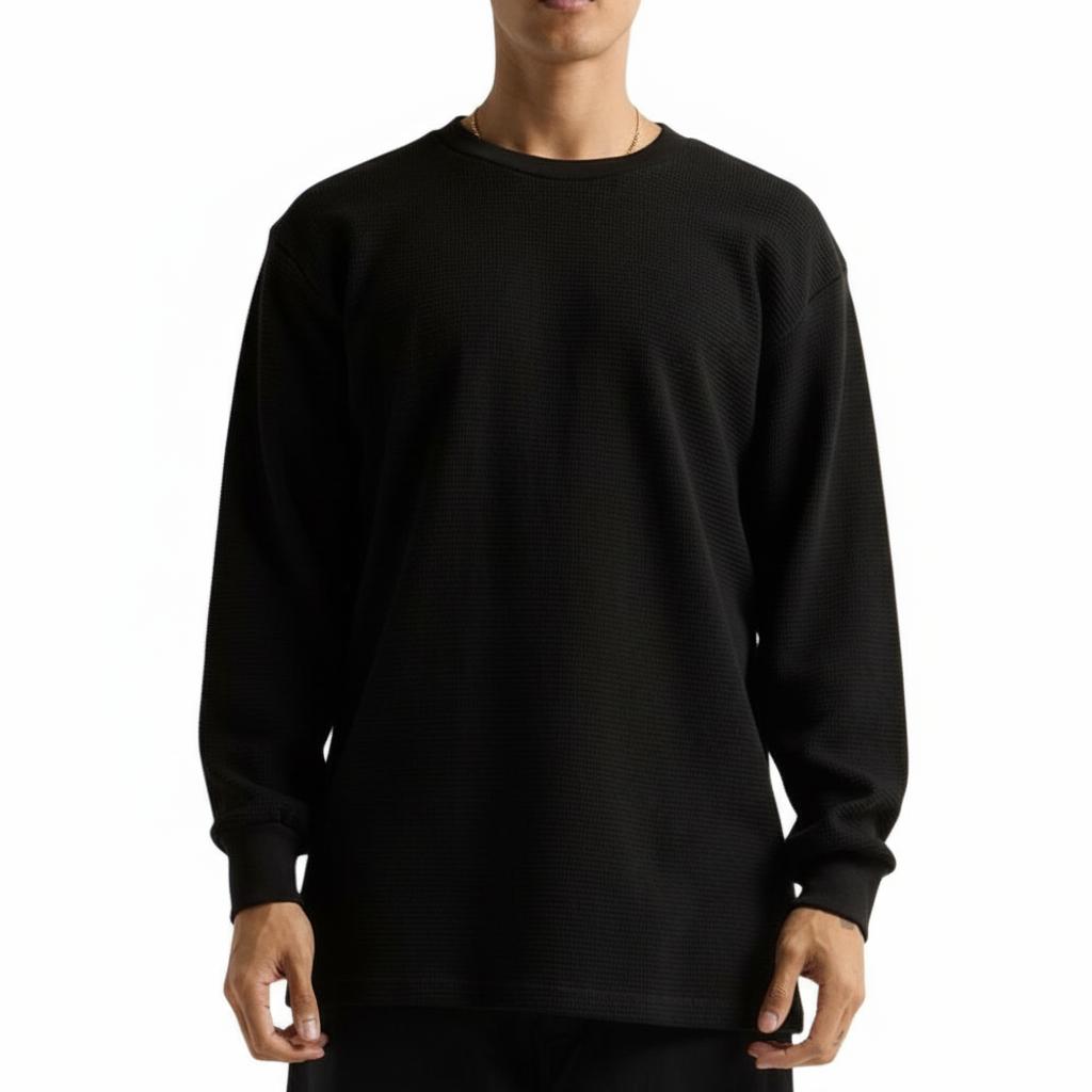 Yarn Count: 18 Singles / 8.9 oz 100% USA Cotton Heather Grey: 90% USA Cotton / 10% Polyester Charcoal Grey: 50% USA Cotton / 50% Polyester Shoulder-to-shoulder neck tape 1" double-needle stitched bottom hem 1" neck ribbing Ribbed wrist cuffs Forward-thrusted shoulder seam for comfortable neck fit Woven neck and side-seam labels Detail Look