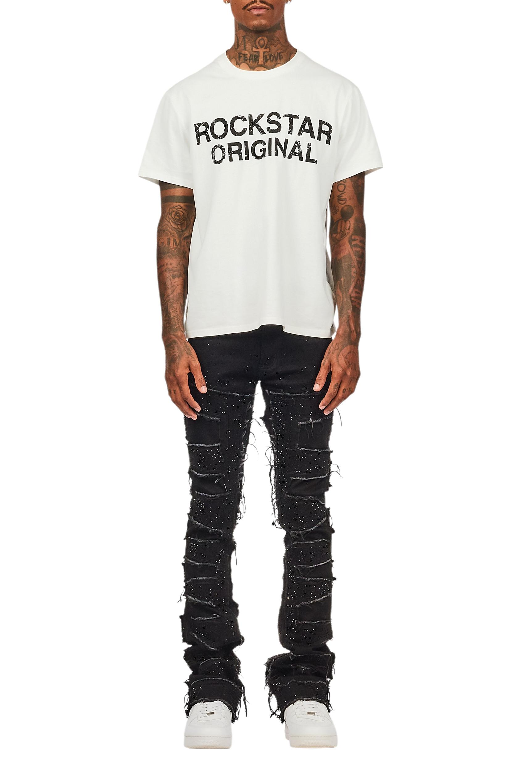 An urban stacked flare denim jean for men in black. Designed with custom rhinestone detailing and extra long legs for a must-cop streetwear staple piece. Zip fly with button closure 5-pocket build Bootcut silhouette Frayed seams Custom rhinestone designing Flared leg openings 35.75" seams *NOTE: These jeans are purposefully designed with extra long legs so the fabric properly bunches at the hem, creating the stacked flare style.