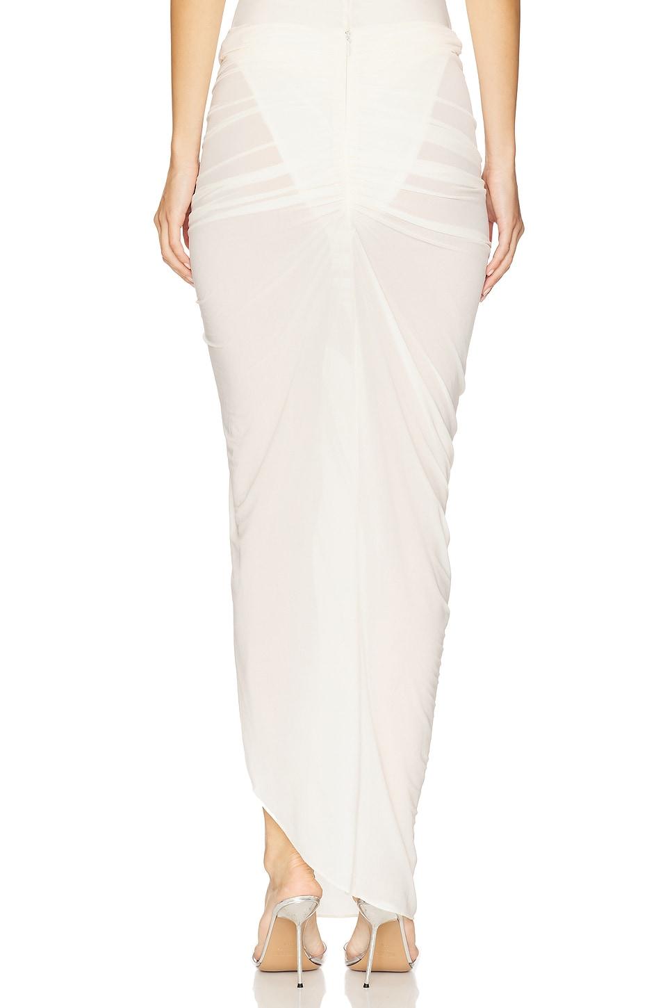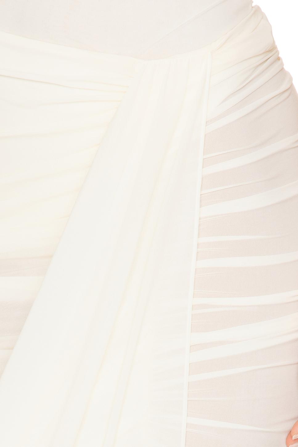 90% polyester, 10% spandex. Dry clean only. Partially lined with brief. Elasticized waistband. Gusset button snap closure. Mesh fabric with asymmetrical hem. Garment is made with a semi-sheer fabric, undergarments can show through. Waist to shortest hem measures approx 11" and to longest hem approx 40.5" in length. Made in China. Revolve Style No. RONR-WQ192. Manufacturer Style No. 4219153TJE.