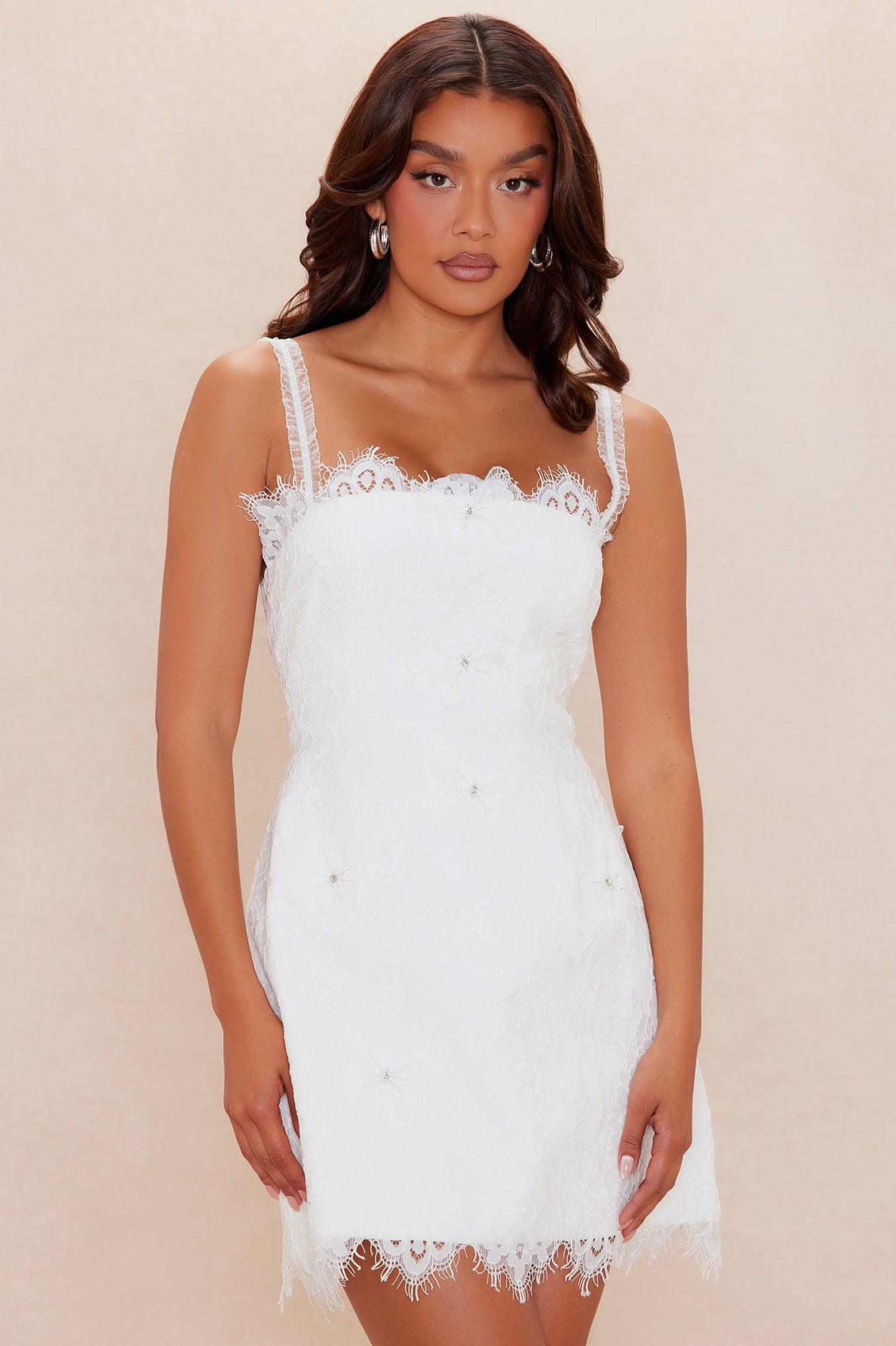 Available In White And Black. Lace Mini Dress Spaghetti Straps Straight Neckline Lace Trim Embellished Back Zipper Closure Lined Non Stretch Shell: 100% Nylon Lining1 & 2: 95% Polyester 5% Spandex Imported