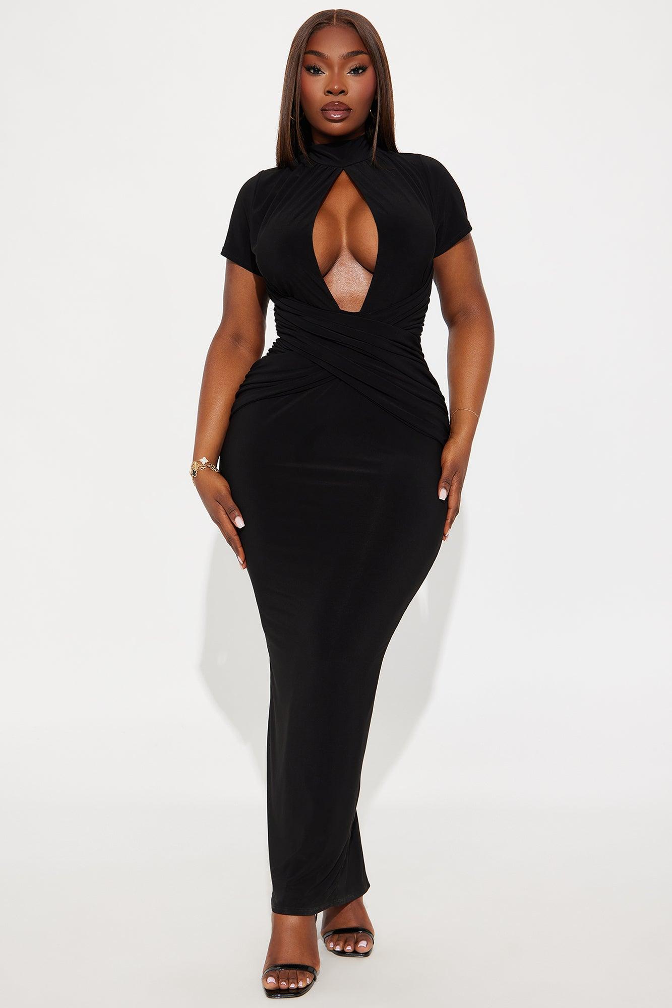 Available In Green And Black. Maxi Dress Short Sleeve Mock Neckline Cut Out Back Slit Wrap Detail Back Slit Hidden back Zipper Stretch 95% Polyester 5% Spandex Imported California Proposition 65WARNING: Cancer and Reproductive Harm - www.P65Warnings.ca.gov.