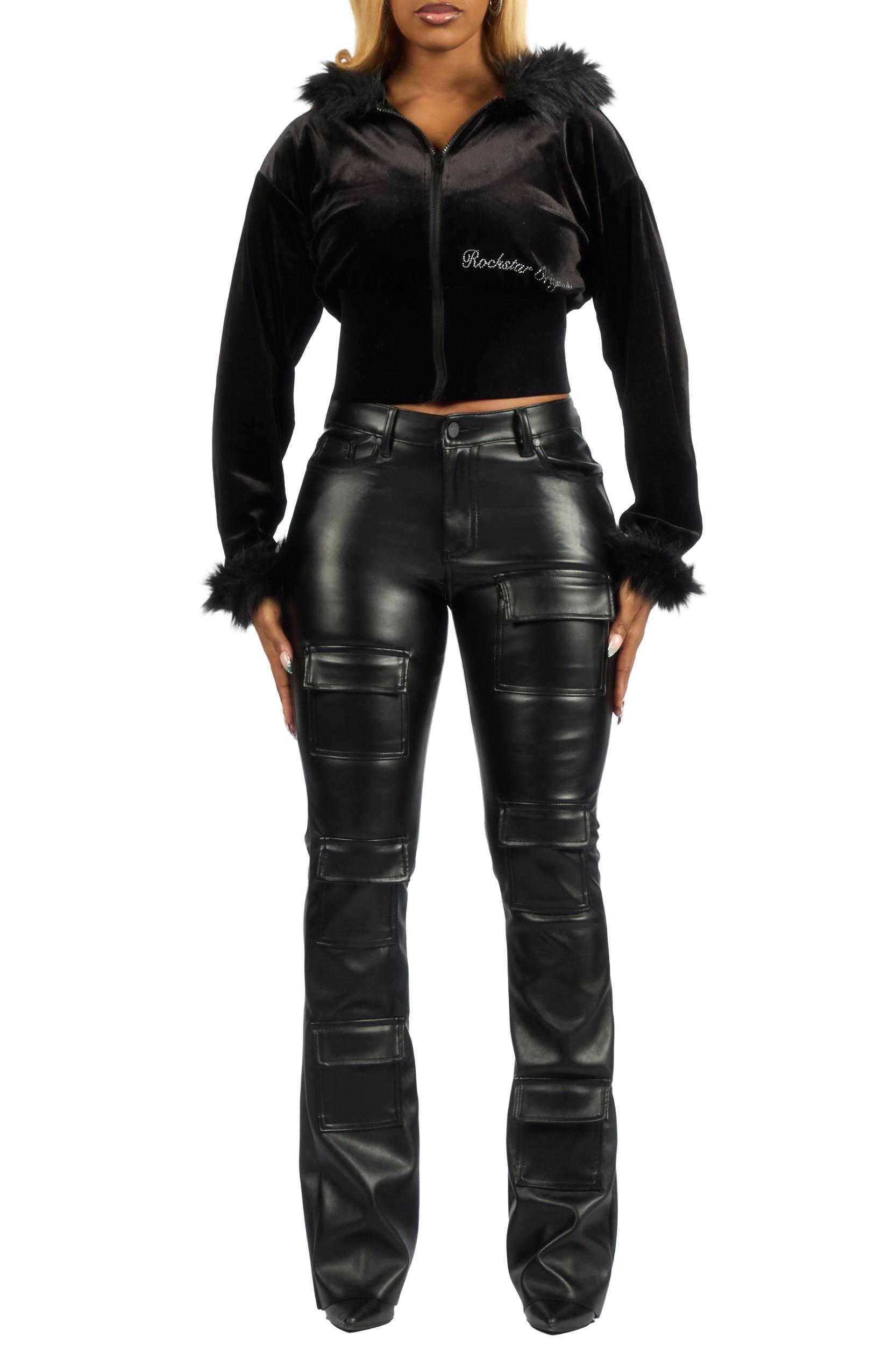 A signature full zip hooded cropped jacket for women in black. Designed with a super cropped length and ultra soft faux fur detailing for a versatile layering piece. Drawstring hood Faux fur trim Velour fabric Custom rhinestone detailing Custom RSO Logo Full front zip closure Super cropped length