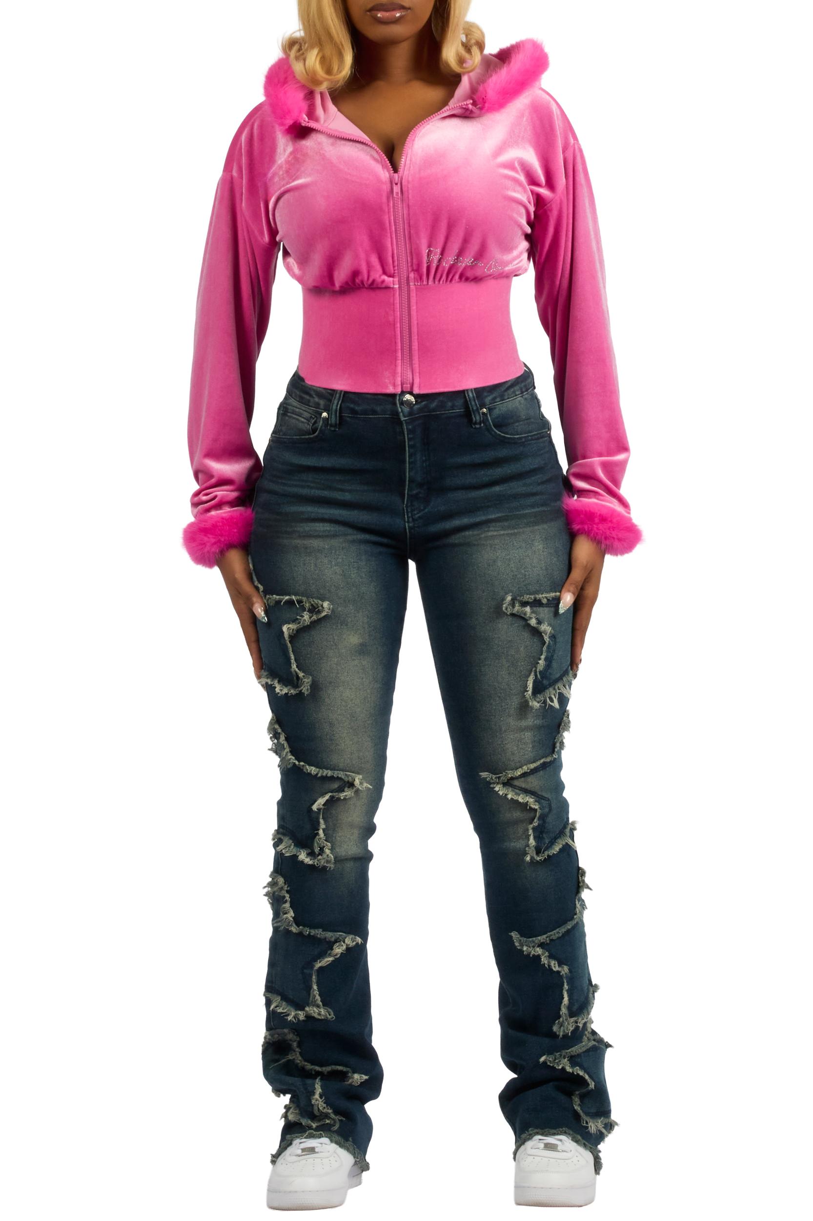 A signature full zip hooded cropped jacket for women in pink. Designed with a super cropped length and ultra soft faux fur detailing for a versatile layering piece. Drawstring hood Faux fur trim Velour fabric Custom rhinestone detailing Custom RSO Logo Full front zip closure Super cropped length