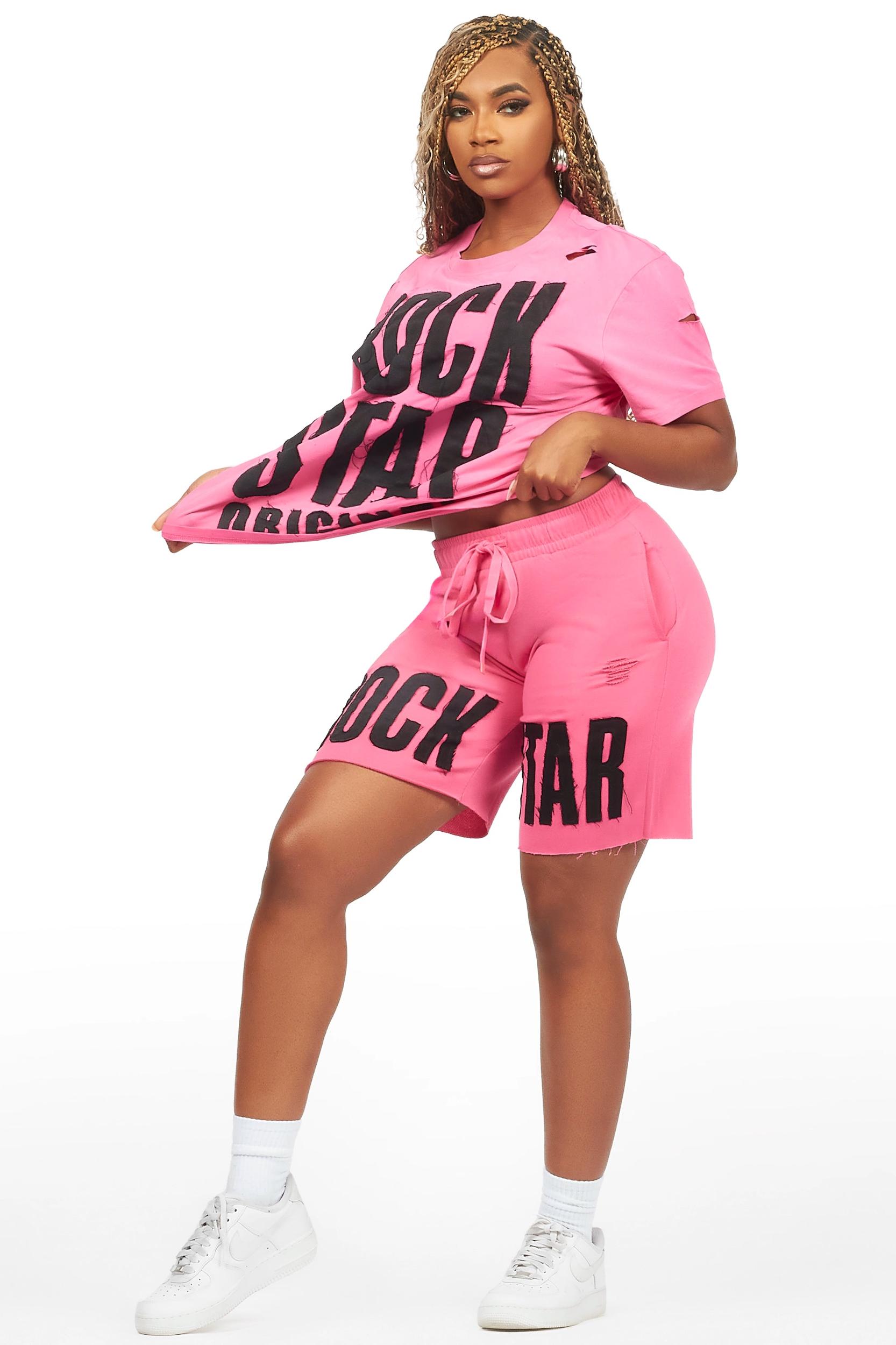 An urban two-piece athleisure tee and short set for women in pink. Designed with organic cotton and custom detailing for a lightweight everyday set. Crew neckline Short sleeves Pullover style Relaxed-fit Drawstring waistband Mid-rise waist line Dual slant pockets Barrel-leg trousers Custom RSO logos