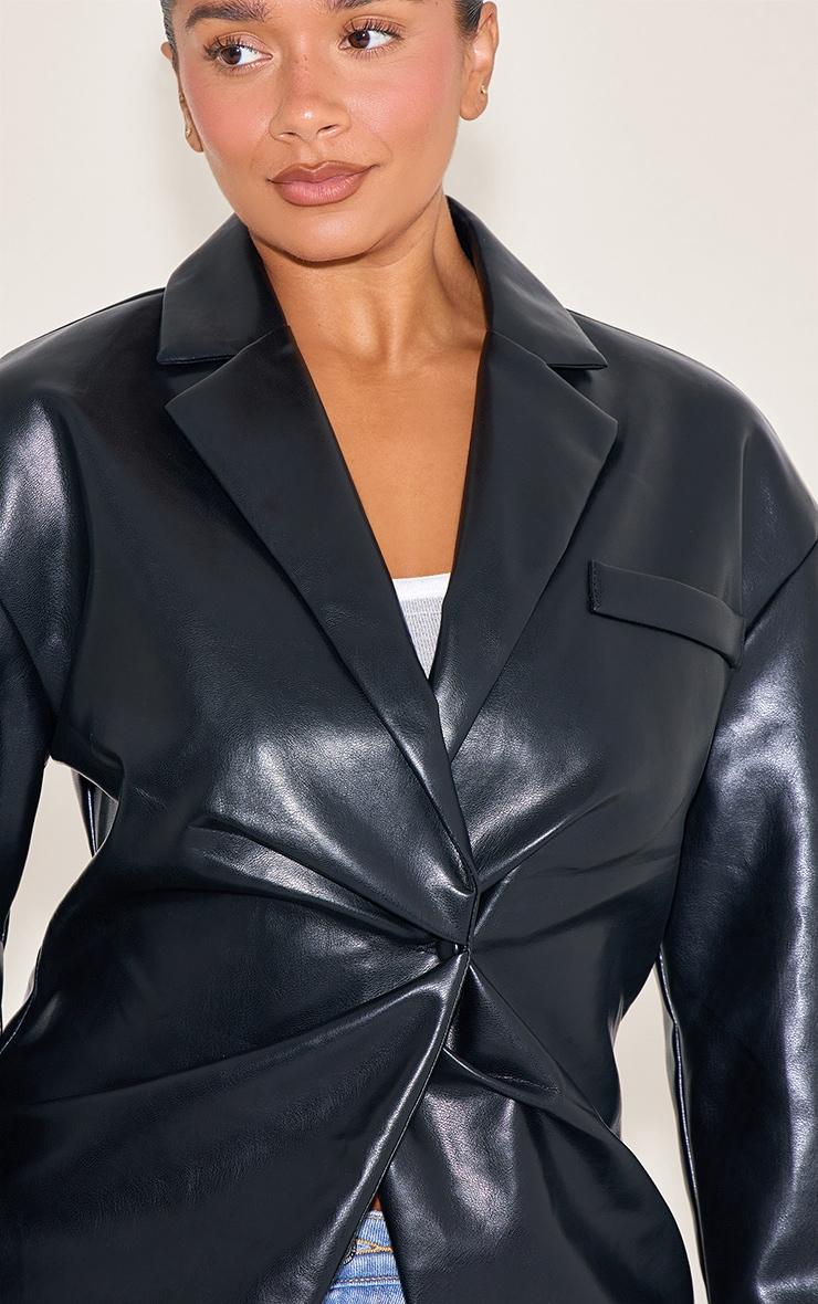 Designed with hourglass figures in mind these curve enhancing tweaks do the most (for both your figure and confidence). PLT Shape looks good on you. A fresh take on the classic blazer arrives to define your evening edit. The shape black faux leather cinched waist blazer reworks conventional tailoring with its sharp lapels and structured shoulders, creating a powerful silhouette. While the image shows a relaxed styling, its precise cinched waist detail ensures a refined profile that flatters. Featuring a single button fastening for an effortless drape and sleek flap pockets, this black blazer is designed for impact. Pair it with tailored wide-leg pants and sharp heeled mules for a confident, polished evening look that transitions seamlessly from dinner to drinks.Length approx 48.5cm/19inch (Based on sample size US 4)Model wears size UK 8/ EU 36/ AUS 8/ US 4Model Height - 5ft 7inchp]:!mb-4inch>Brand: PrettyLittleThingCategory: OuterwearProduct type: Fitted BlazerColor: BlackMaterial: Faux LeatherOccasion: Evening