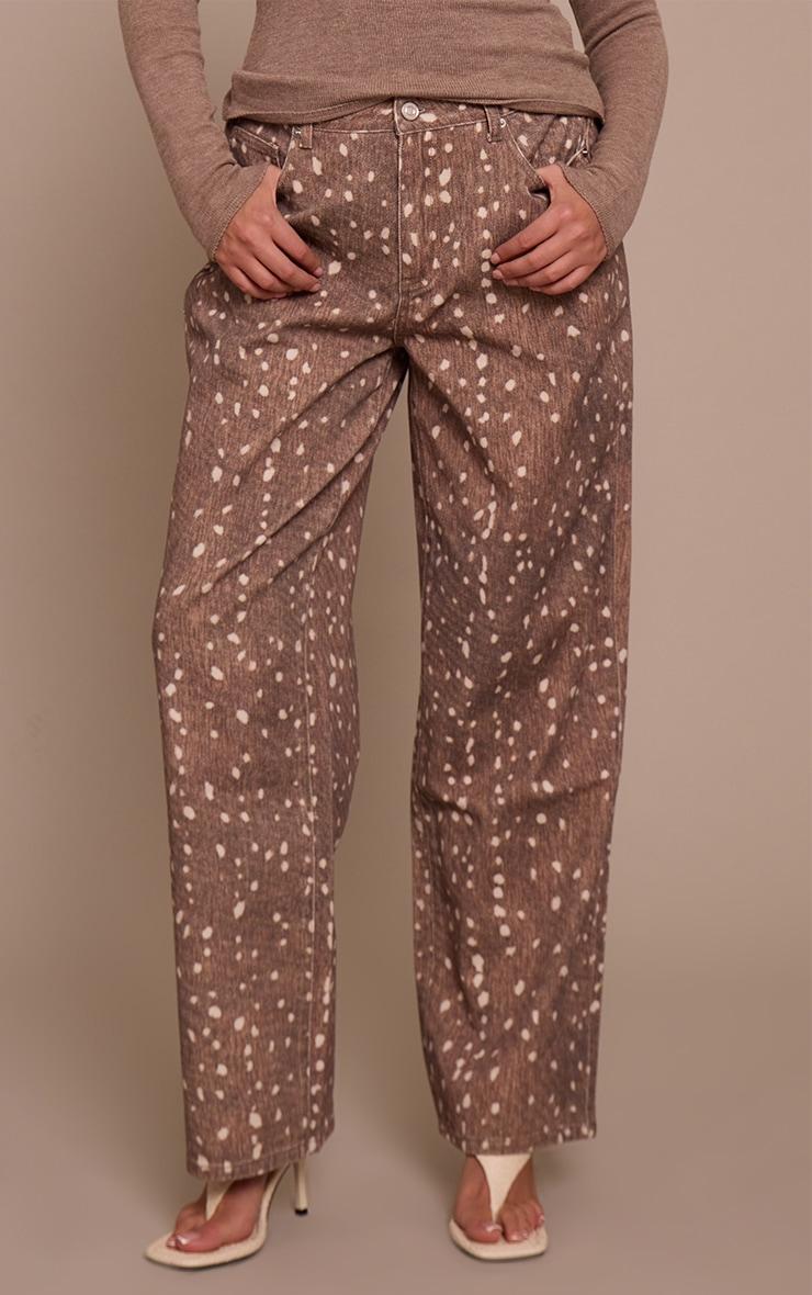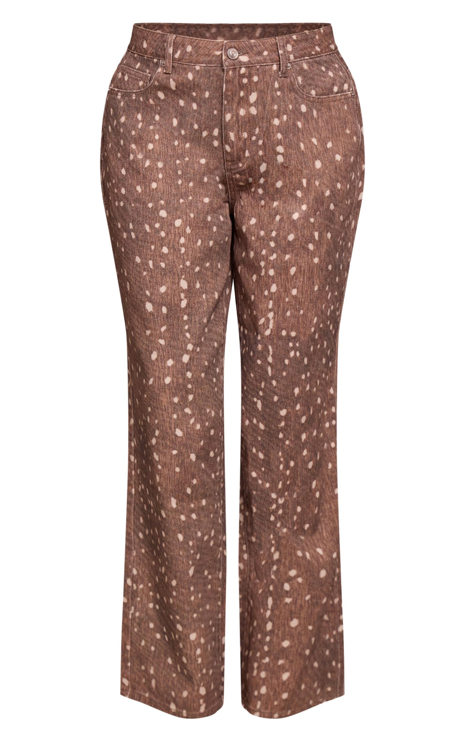 Designed with hourglass figures in mind these curve enhancing tweaks do the most (for both your figure and confidence). PLT Shape looks good on you. Make your mark with denim that dares to be different. The shape brown fawn print denim wide leg jeans command attention with their distinctive all-over fawn print against a rich brown hue. Designed with a flattering wide-leg silhouette, these jeans feature a classic button and zip fastening that cinches the waist, creating an elongated line. Pair these statement pants with a sleek, fitted black bodysuit or a sophisticated off-shoulder top for an elevated ensemble. Complete the look with elegant nude heels to enhance the wide-leg cut and delicate gold stud earrings for a refined finish. This is how you own the room, effortlessly.Length approx 76cm/30inch (Based on sample size US 4)Model wears size UK 8/ EU 36/ AUS 8/ US 4Model Height - 5ft 9inchp]:!mb-4inch>Brand: PrettyLittleThingCategory: DenimProduct type: Wide Leg JeansColor: BrownMaterial: Rigid DenimOccasion: Occasion