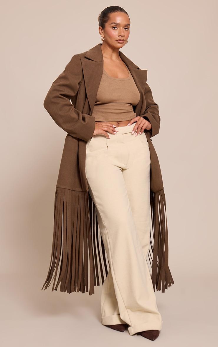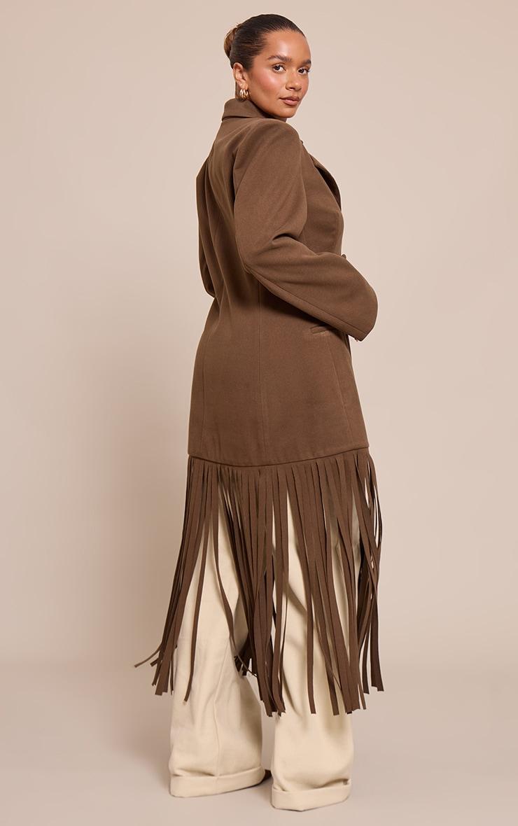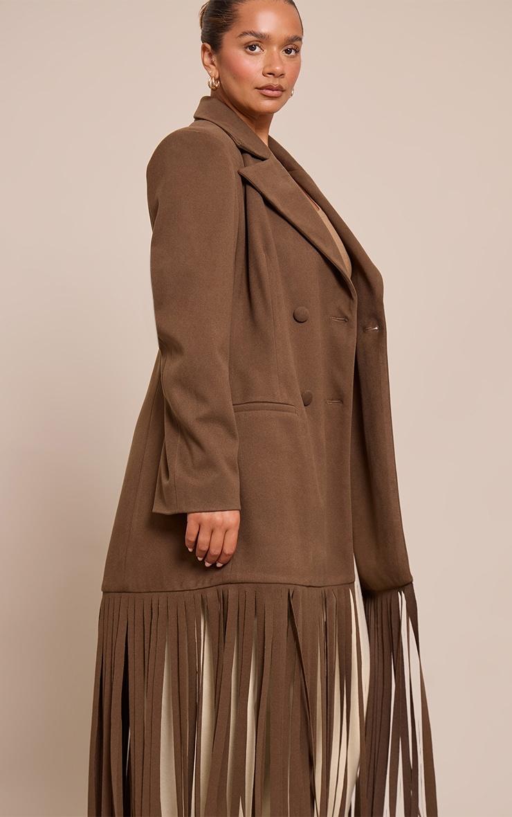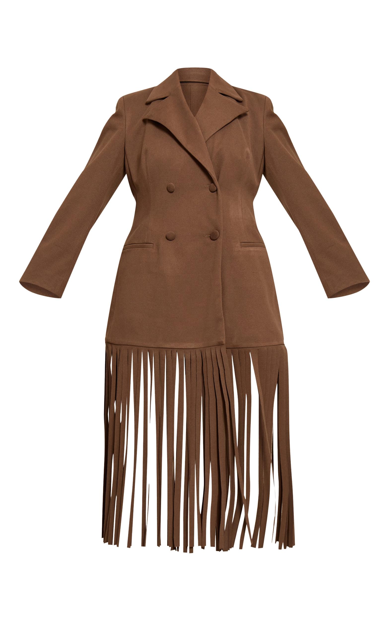 Designed with hourglass figures in mind these curve enhancing tweaks do the most (for both your figure and confidence). PLT Shape looks good on you.Make an undeniable entrance with a piece that blends structure with dynamic flair. The shape brown wool look cinched waist fringe hem blazer redefines your day edit, presented in a rich brown hue. This artful outerwear boasts sharp collared lapels, leading to a confident double-breasted fastening, while structured shoulders give way to a silhouette that subtly cinches at the waist. An unmissable fringe hem adds artful movement to every stride, ensuring a knowing touch. Layer it over tailored wide-leg pants and a fitted Vest for an assured day look, grounding your ensemble with sleek black heels for a sharp finish. Complete the aesthetic with subtle gold stud earrings, curating a confident, knowing look that moves with effortless poise.Length approx 134.5cm/53inch (Based on sample size US 4)Model wears size UK 8/ EU 36/ AUS 8/ US 4Model Height - 5ft 7inchp]:!mb-4inch>Brand: PrettyLittleThingCategory: OuterwearProduct type: Fitted BlazerColor: BrownMaterial: Faux WoolOccasion: Day