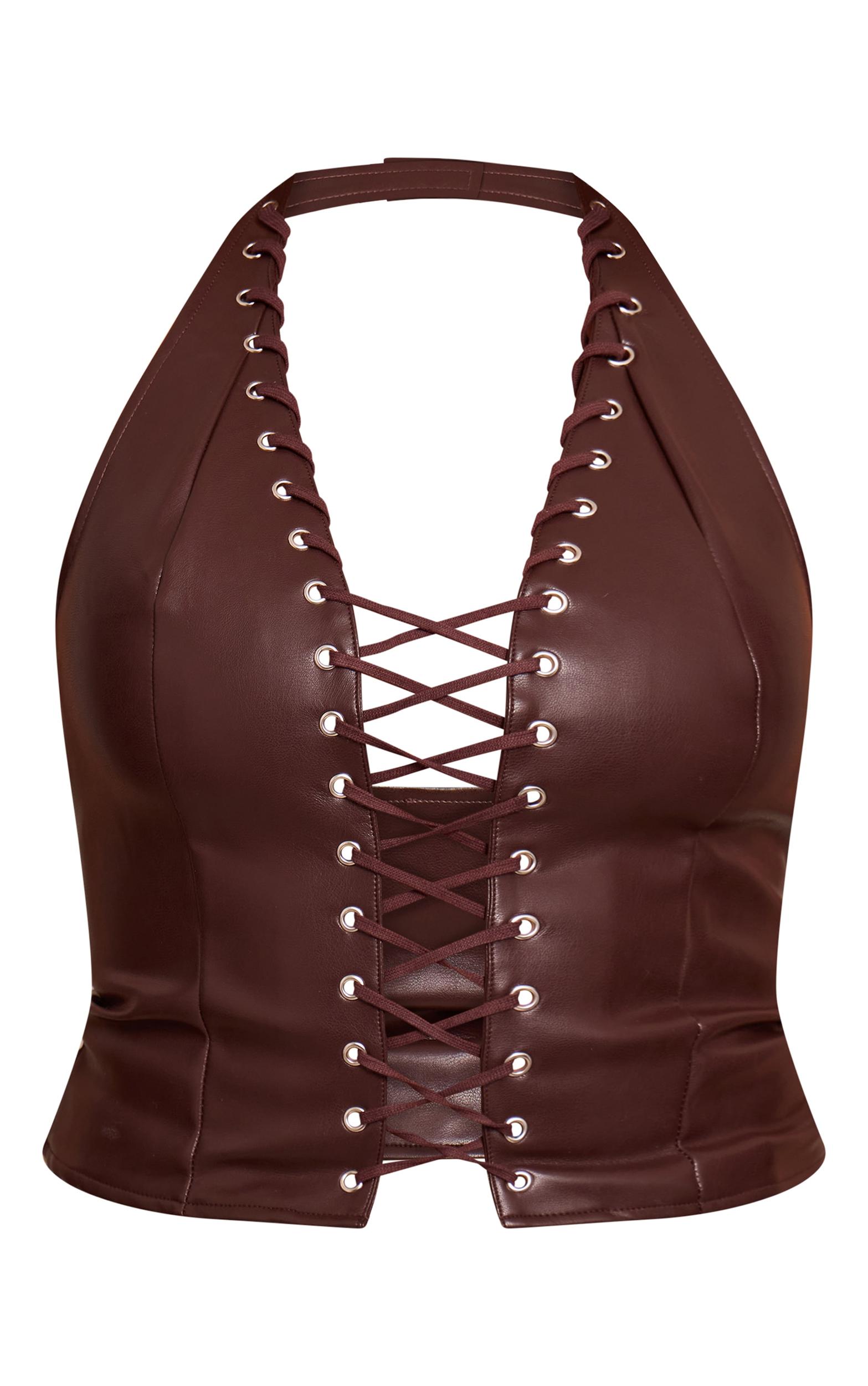 Designed with hourglass figures in mind these curve enhancing tweaks do the most (for both your figure and confidence). PLT Shape looks good on you.Say hello to the shape chocolate faux leather halter neck lace up corset. Made from faux leather, this corset has a lace up design, halter neckline and a hip length fit. Pair it witgh wide leg pants and heels for a chic finish.Length approx 48.5cm/19inch (Based on sample size US 4)Model wears size UK 8/ EU 36/ AUS 8/ US 4Model Height - 5ft 9inchp]:!mb-4inch>Brand: PrettyLittleThingCategory: TopsProduct type: CorsetColor: ChocolateMaterial: Faux LeatherOccasion: Evening