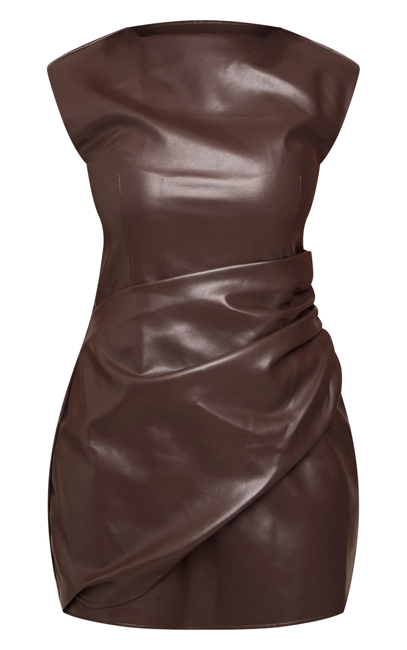 Own the night in the artfully designed shape chocolate faux leather ruched panel mini dress. Its chocolate faux leather boasts a sleek boat neckline and a defining ruched panel, crafting a modern mini silhouette. Perfect for confident after-dark events. Pair with sleek knee high boots and minimal accessories for an effortlessly artful look.Length approx 81.5cm/32inch (Based on sample size US 4)Model wears size UK 8/ EU 36/ AUS 8/ US 4Model Height - 5ft 7inchp]:!mb-4inch>Brand: PrettyLittleThingCategory: DressesProduct type: Bodycon DressColor: ChocolateMaterial: Faux LeatherDesign: PlainNeckline: CrewSleeves: SleevelessOccasion: Evening