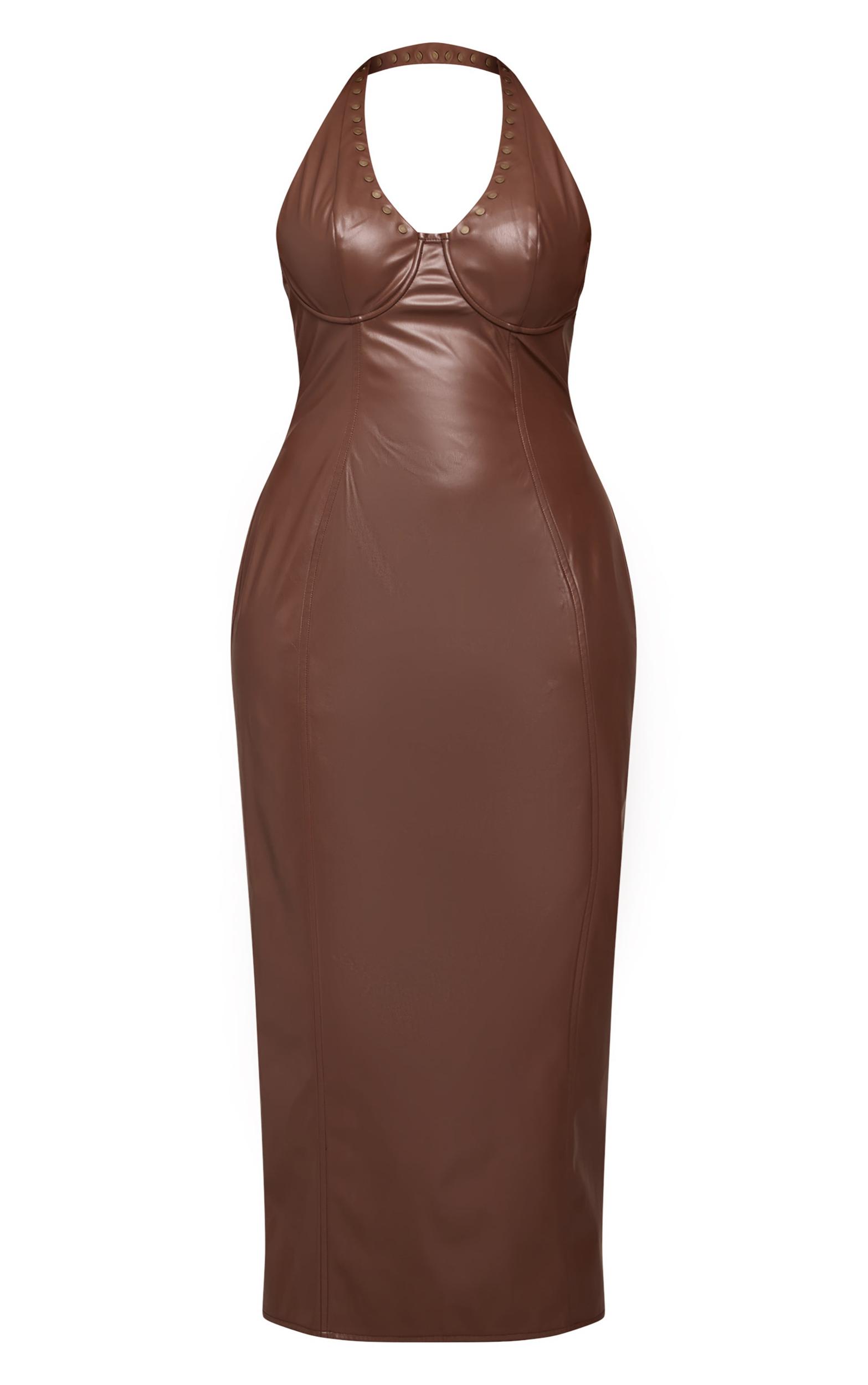 Designed with hourglass figures in mind these curve enhancing tweaks do the most (for both your figure and confidence). PLT Shape looks good on you.Unveil your bold aesthetic with this chocolate bodycon shape chocolate faux leather studded halter neck maxi dress. This piece features a striking studded halter neckline, a defined bustier, and a sleek maxi length in a faux leather look. It’s the ultimate choice for evening outings or making a confident statement at any occasion. Complete your ensemble with barely-there gold heels and a delicate gold ring for an impactful finish.Length approx 155cm/61inch (Based on sample size US 4)Model wears size UK 8/ EU 36/ AUS 8/ US 4Model Height - 5ft 7inchp]:!mb-4inch>Brand: PrettyLittleThingCategory: DressesProduct type: Bodycon DressColor: ChocolateMaterial: Faux LeatherDesign: PlainNeckline: PlungeSleeves: Sleeveless