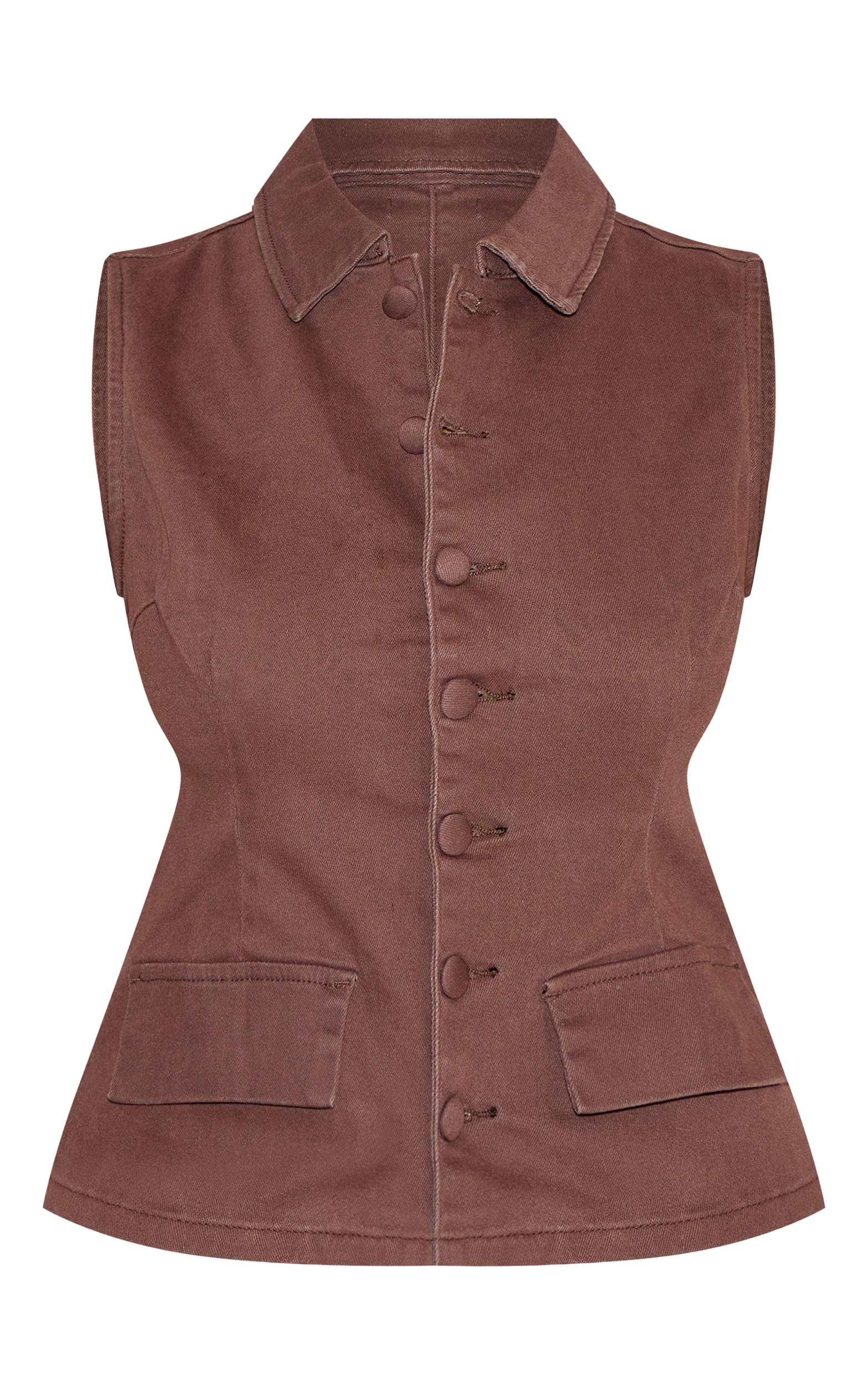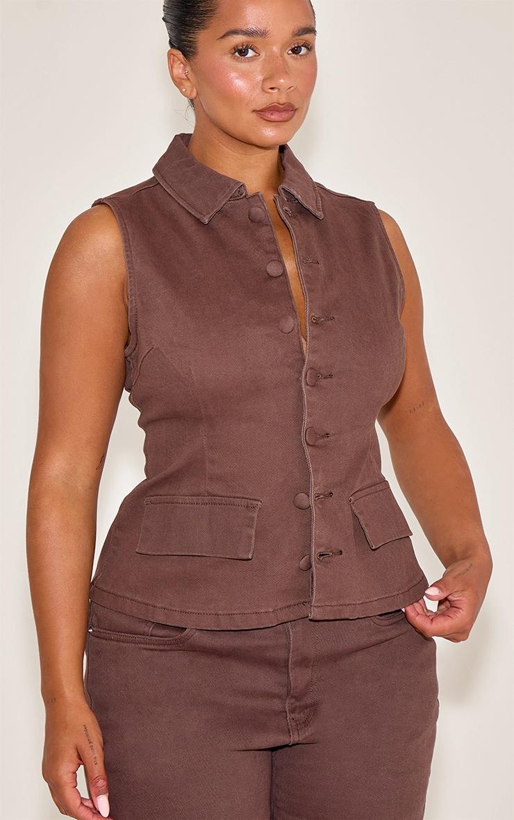 Designed with hourglass figures in mind these curve enhancing tweaks do the most (for both your figure and confidence). PLT Shape looks good on you. Master understated cool with a fresh take on denim. The shape chocolate stretch denim button front longline top redefines daywear, offering a sleek, sleeveless silhouette crafted with a sharp collared neckline and a clean button-front fastening that extends to its modern longline hem. Subtle flap pockets at the front complete its knowing design. Perfectly paired with its matching chocolate denim pants for a cohesive two piece set that owns the room, this piece also works effortlessly with crisp white wide-leg pants and sleek loafers for an assured, polished daytime aesthetic.Length approx 48.5cm/19inch (Based on sample size US 4)Model wears size UK 8/ EU 36/ AUS 8/ US 4Model Height - 5ft 2inchp]:!mb-4inch>Brand: PrettyLittleThingCategory: DenimProduct type: Denim TopColor: ChocolateOccasion: Day