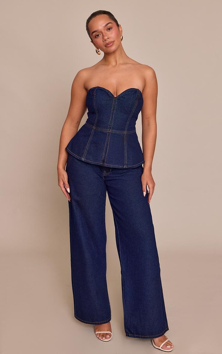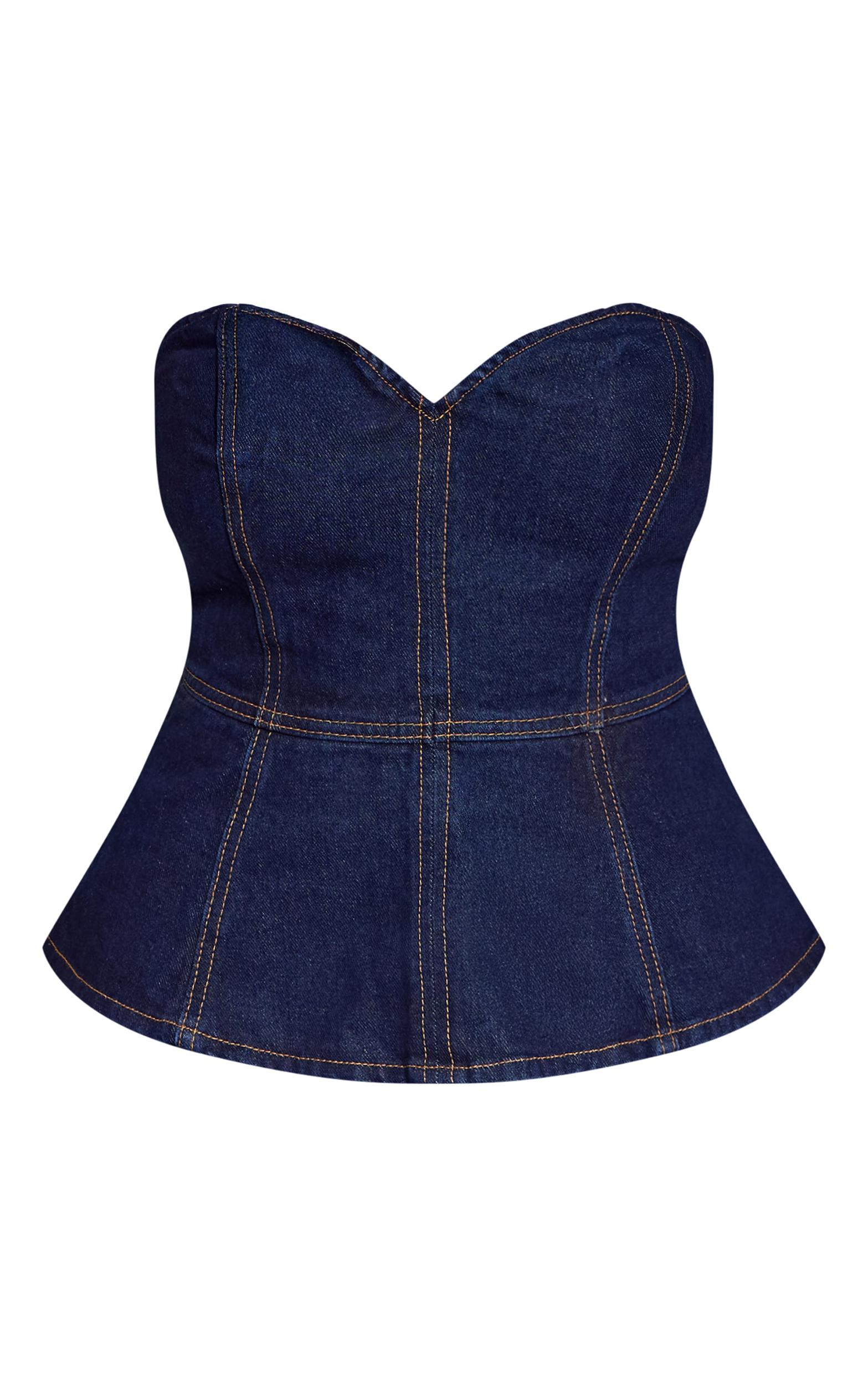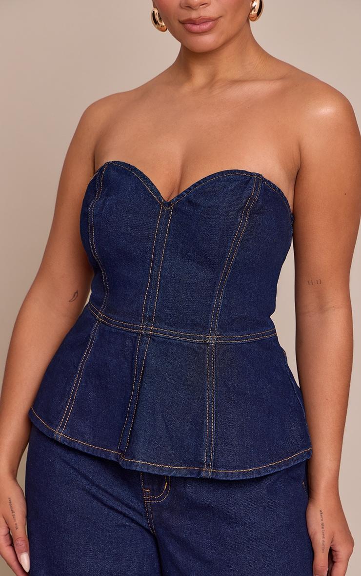 Designed with hourglass figures in mind these curve enhancing tweaks do the most (for both your figure and confidence). PLT Shape looks good on you.Make an undeniable statement in a modern denim silhouette. The shape indigo sweetheart neckline denim peplum top redefines denim daywear with its artful construction, featuring a flattering sweetheart neckline and a cinched waist that flows into a distinct peplum hem, all highlighted by contrasting stitching for a sharp finish. Pair this indigo piece with its matching wide-leg pants for a bold, cohesive aesthetic, or style with sleek black tailored pants for an elevated contrast. Complete the look with striking gold heels for an unexpected lift, then finish with some delicate silver jewelry to refine your presence. This is denim, remastered for the confident dresser.Length approx 34.5cm/13.5inch (Based on sample size US 4)Model wears size UK 8/ EU 36/ AUS 8/ US 4Model Height - 5ft 9inchp]:!mb-4inch>Brand: PrettyLittleThingCategory: DenimProduct type: Denim TopColor: IndigoMaterial: Stretch DenimDesign: PlainNeckline: SweetheartSleeves: BandeauOccasion: Day