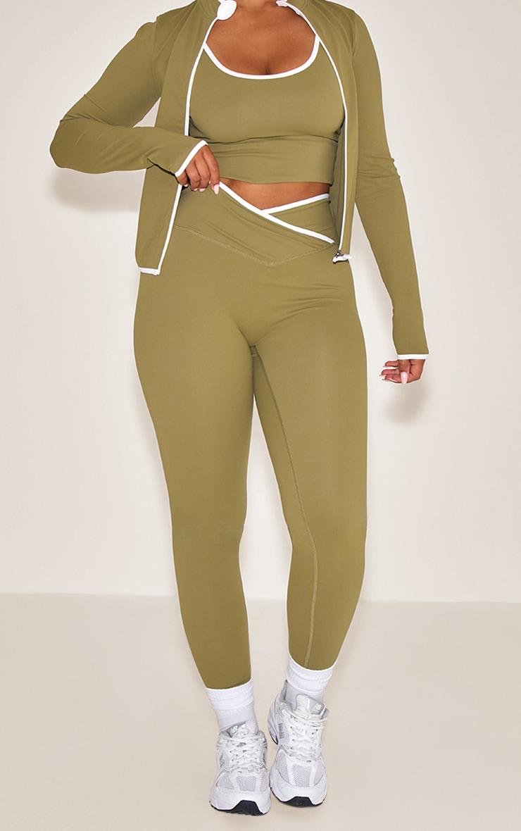 Designed with hourglass figures in mind these curve enhancing tweaks do the most (for both your figure and confidence). PLT Shape looks good on you.Unleash an elevated approach to your activewear rotation. The shape olive active contrast binding wrap waistband leggings present a sleek khaki hue, expertly cut for a confident fit. Their standout feature is the distinctive V-shaped wrap waistband, accentuated with sharp white contrast binding that continues down the leg, creating a dynamic silhouette. Build a unified aesthetic by teaming these leggings with the coordinating khaki sports top and an open zip-up jacket, rounding off the look with clean white sneakers for a seamless, on-point athleisure statement.Length approx 76cm/30inch (Based on sample size S)Model wears size SModel Height - 5ft 7inchp]:!mb-4inch>Category: AthleisureProduct type: LeggingsColor: KhakiMaterial: Sculpt ActiveDesign: PlainOccasion: Day