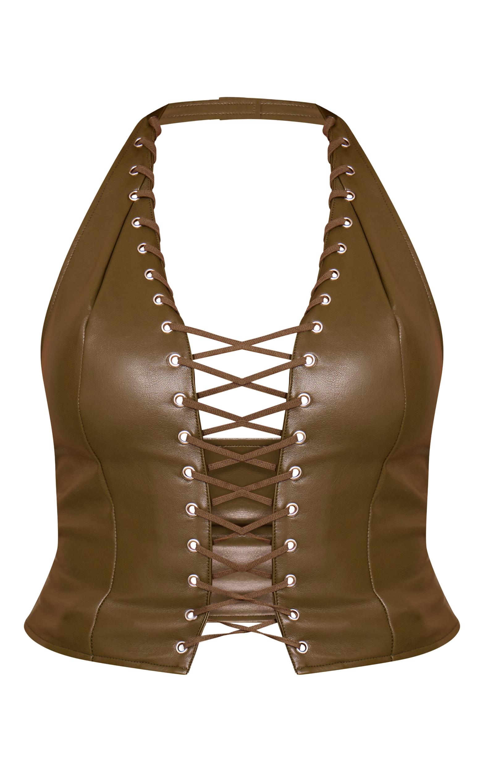 Designed with hourglass figures in mind these curve enhancing tweaks do the most (for both your figure and confidence). PLT Shape looks good on you.Curate an unforgettable evening presence with a piece designed to truly command attention. The shape olive faux leather halter neck lace up corset unveils a confident, sculpted silhouette, defined by its artful halter neckline and the intricate lace-up front, featuring polished eyelets that trace a daring line. Its rich olive hue adds a knowing edge, perfect for after-dark impact. Pair this commanding top with sleek tailored pants to complement its structured form, then complete your self-aware aesthetic with sharp white kitten heels and striking drop earrings for an undeniably polished finish that speaks volumes.Length approx 48.5cm/19inch (Based on sample size US 4)Model wears size UK 8/ EU 36/ AUS 8/ US 4Model Height - 5ft 9inchp]:!mb-4inch>Brand: PrettyLittleThingCategory: TopsProduct type: CorsetColor: OliveMaterial: Faux LeatherOccasion: Evening