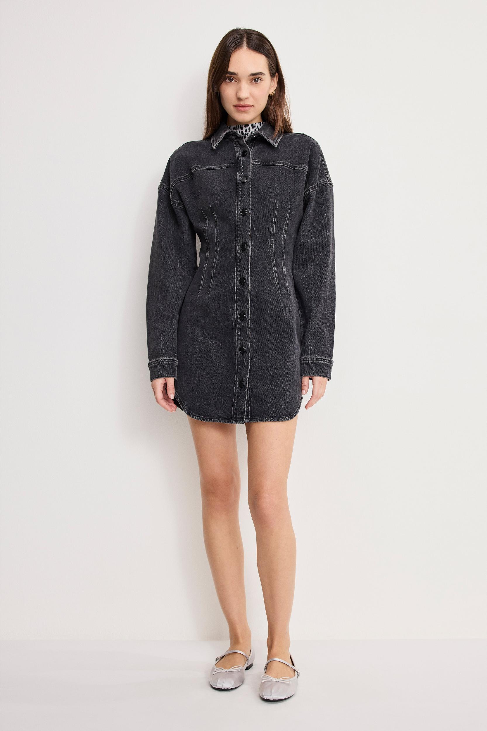 This mini denim dress sculpts your shape while the cinched waistline make you the main event – effortlessly commanding every room you enter. Collar neckline Long sleeves Mini length Model is size XS, 5’8” and wearing size XS. Fabric: 79% Cotton, 20% Recycled Cotton, 1% Elastane Care: Wash inside out in cold water with like colors. Do not bleach. Tumble dry on low. Iron on low heat. Do not dry clean.