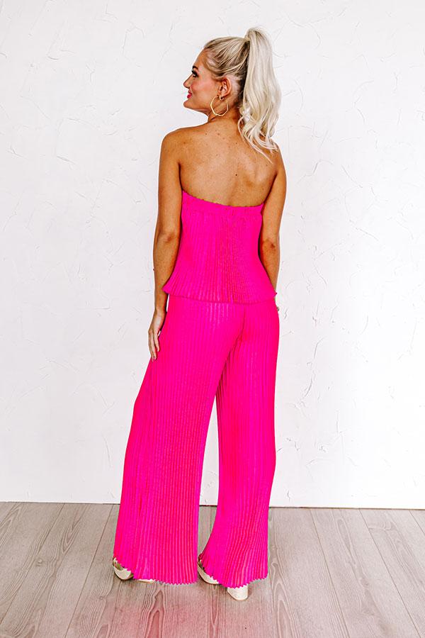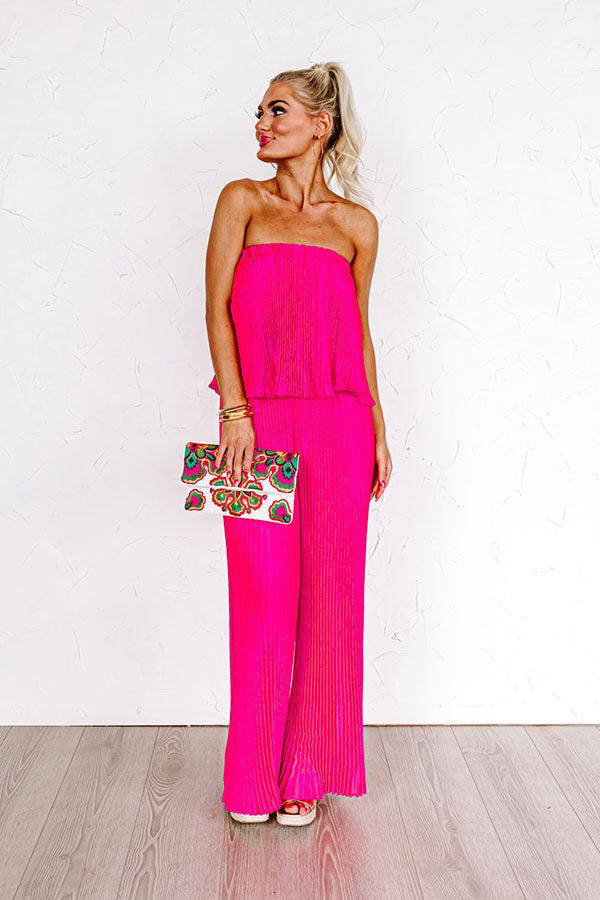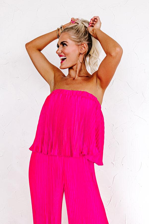 - Keep it chic in this trendy jumpsuit! - Pleated material with a satin finish and a built-in lining ending mid-thigh length - A straight cut elastic neckline - An overlaid bodice - A relaxed silhouette that ends in straight floor length hemlines