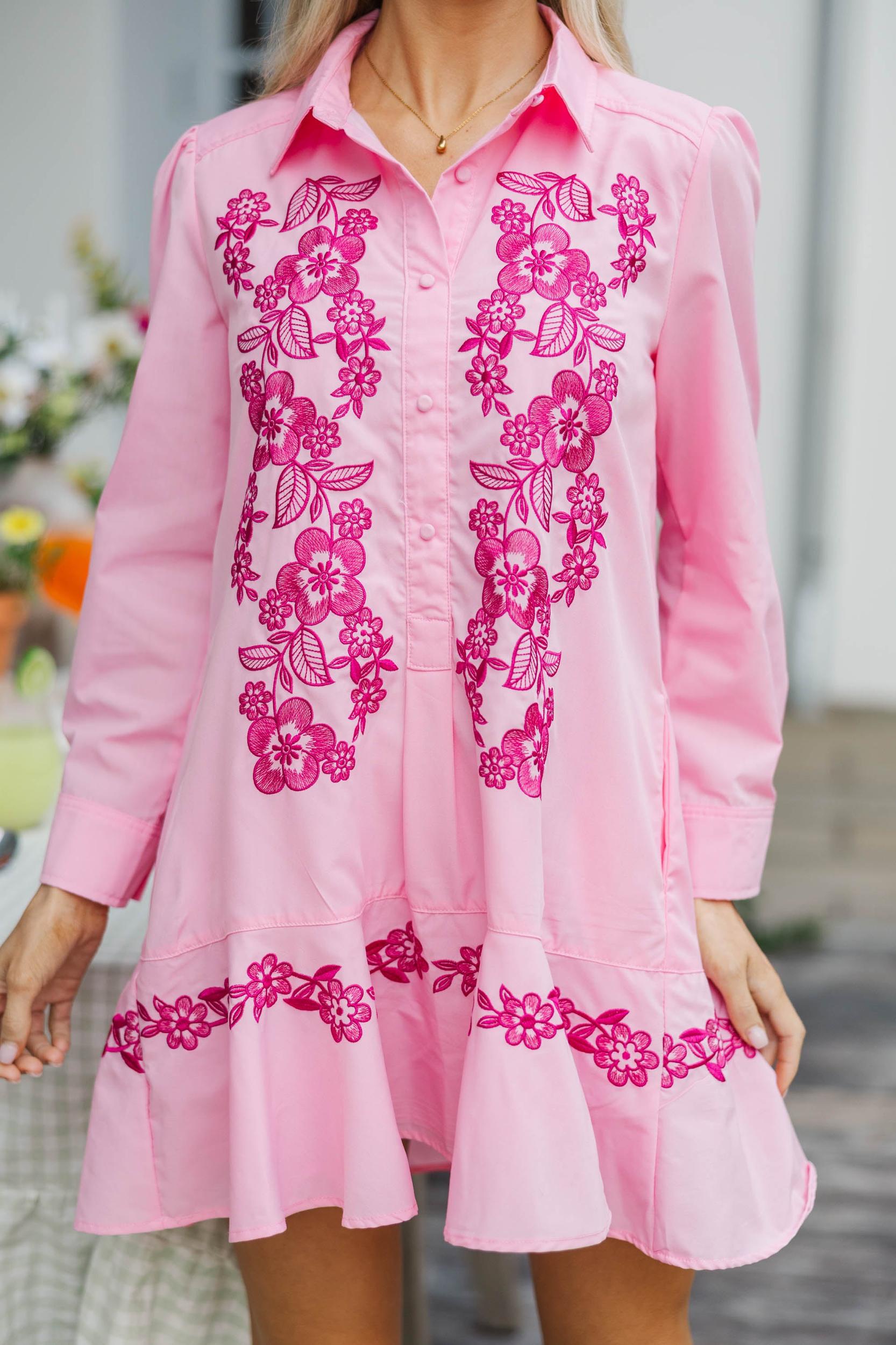 This vibrant embroidered dress is a true showstopper with its bold floral detailing and breezy, feminine silhouette. Lightweight and easy to wear, it’s perfect for spring events, brunch dates, or any day you want to feel a little extra special. Style it with sandals or wedges for an effortlessly polished look. Collared neckline with button-front detail Long sleeves with buttoned cuffs Embroidered floral accents Flowy silhouette with ruffle hemline Lightweight fabric with minimal stretch Baileigh is wearing the small.
