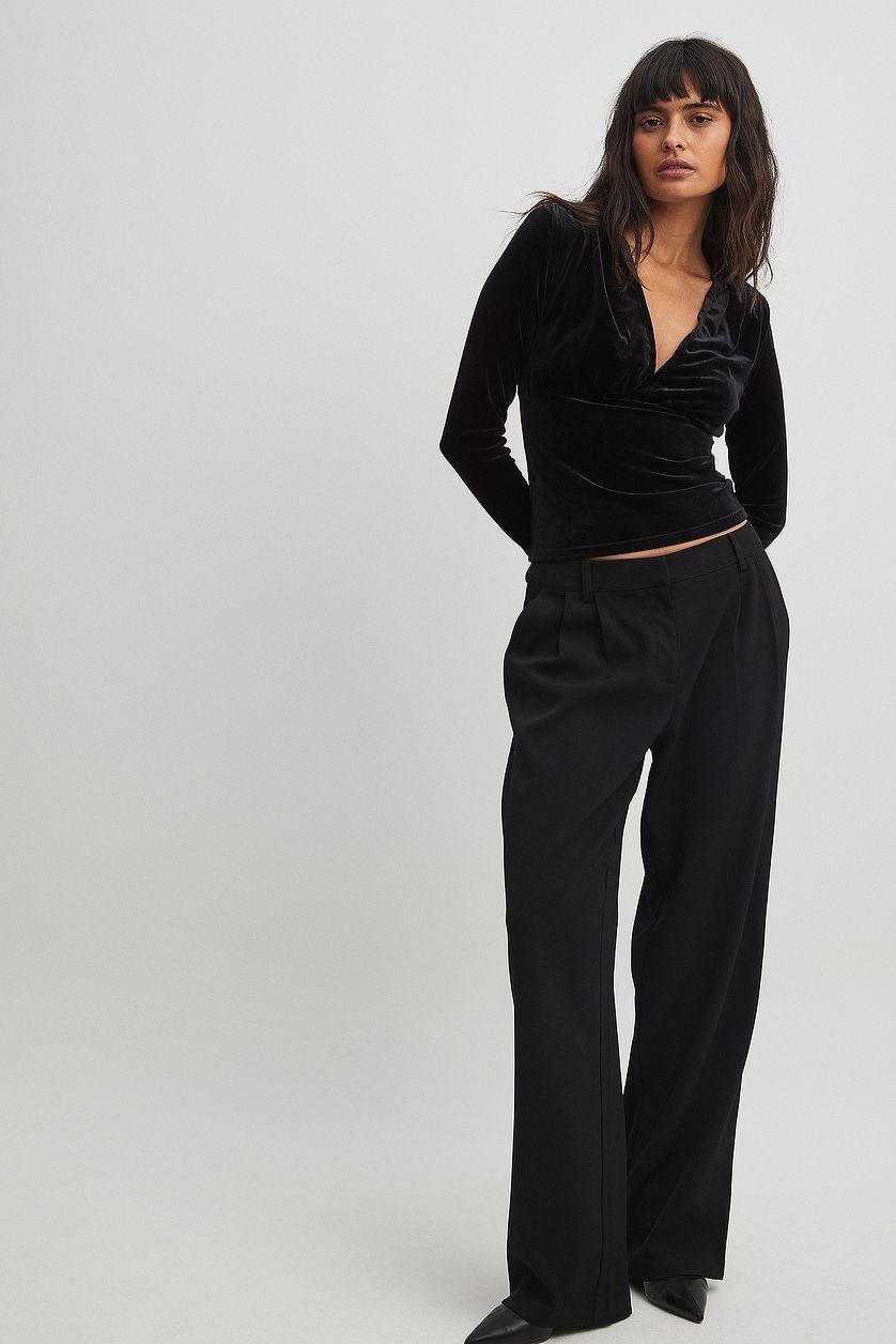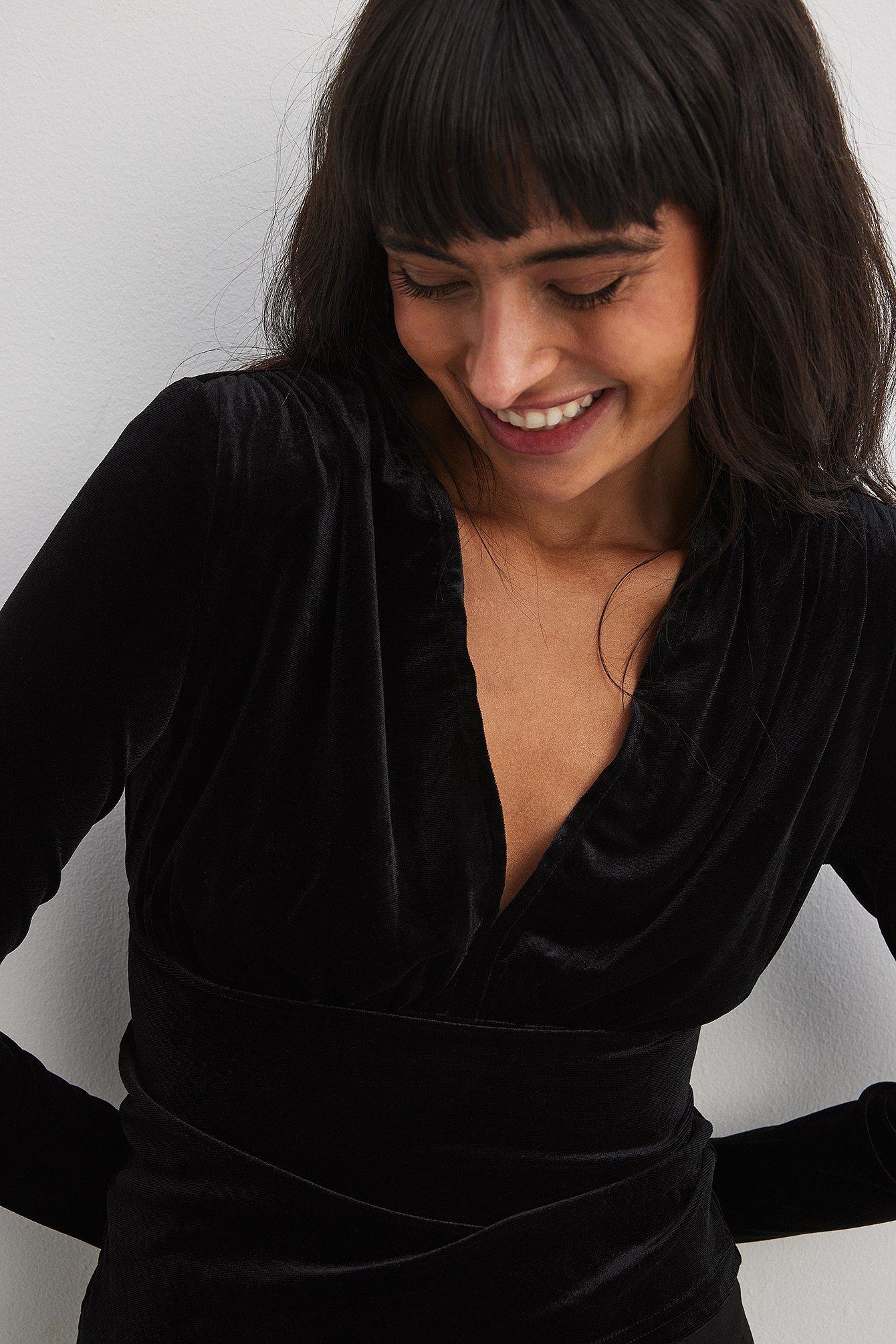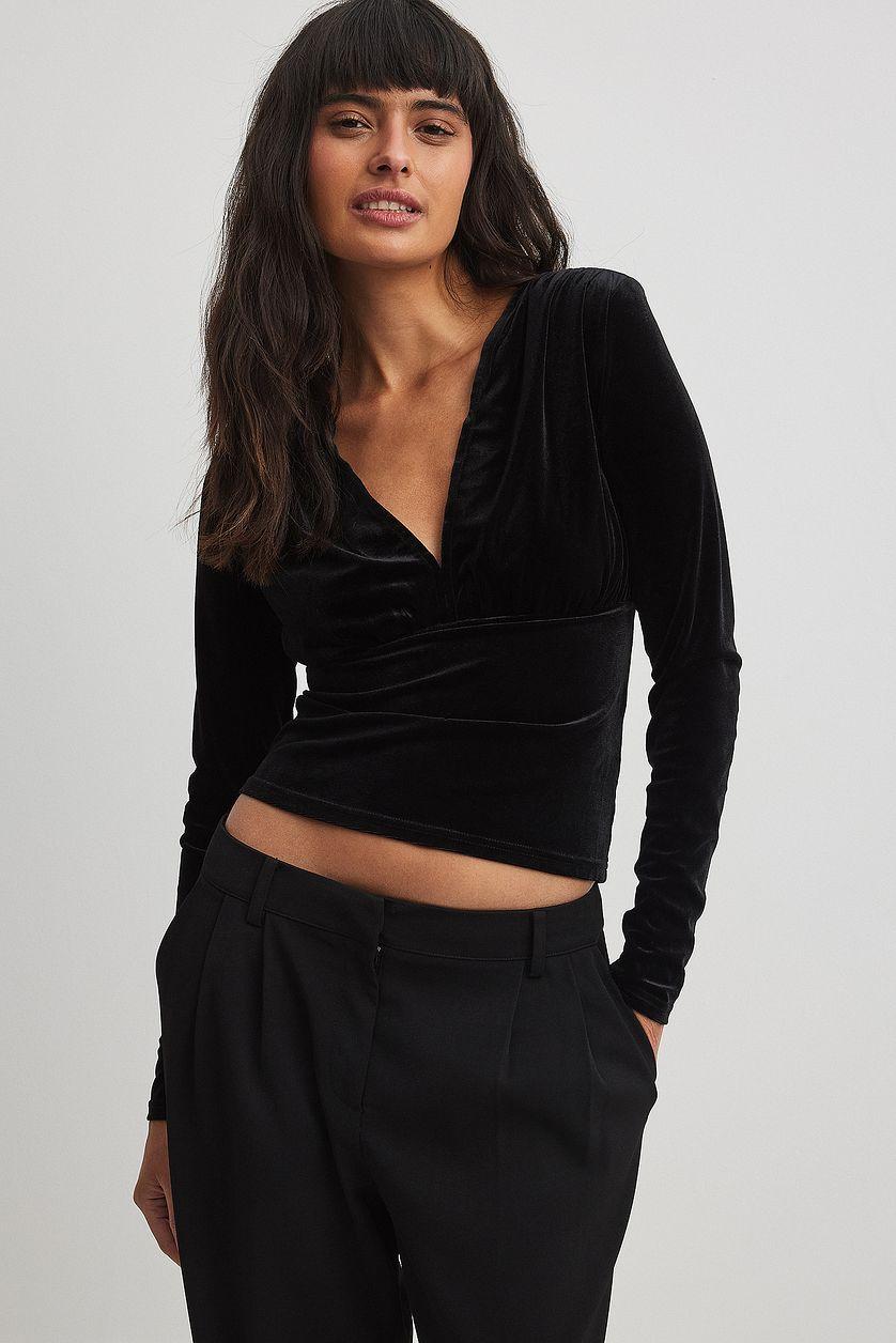 This long sleeve top features a short fit and shiny, stretchy velvet fabric. It has rouched details and a deep v neckline. Our long sleeve top features shoulder pads.