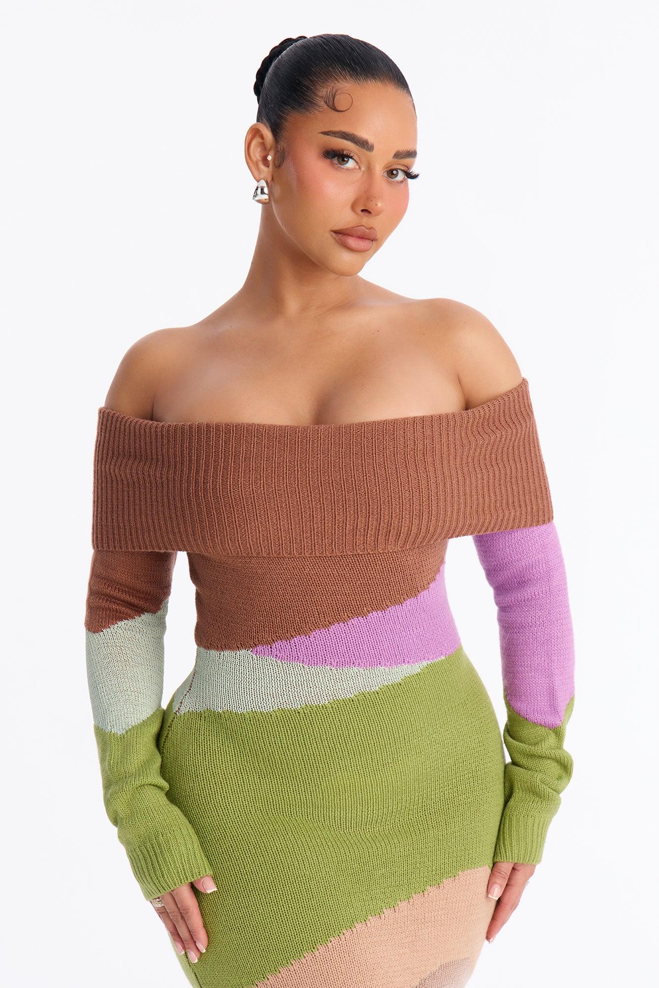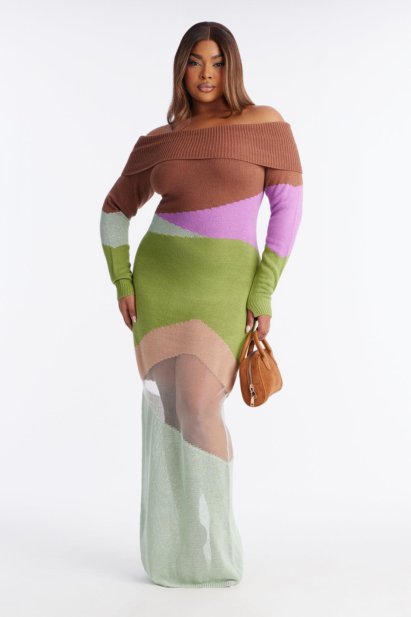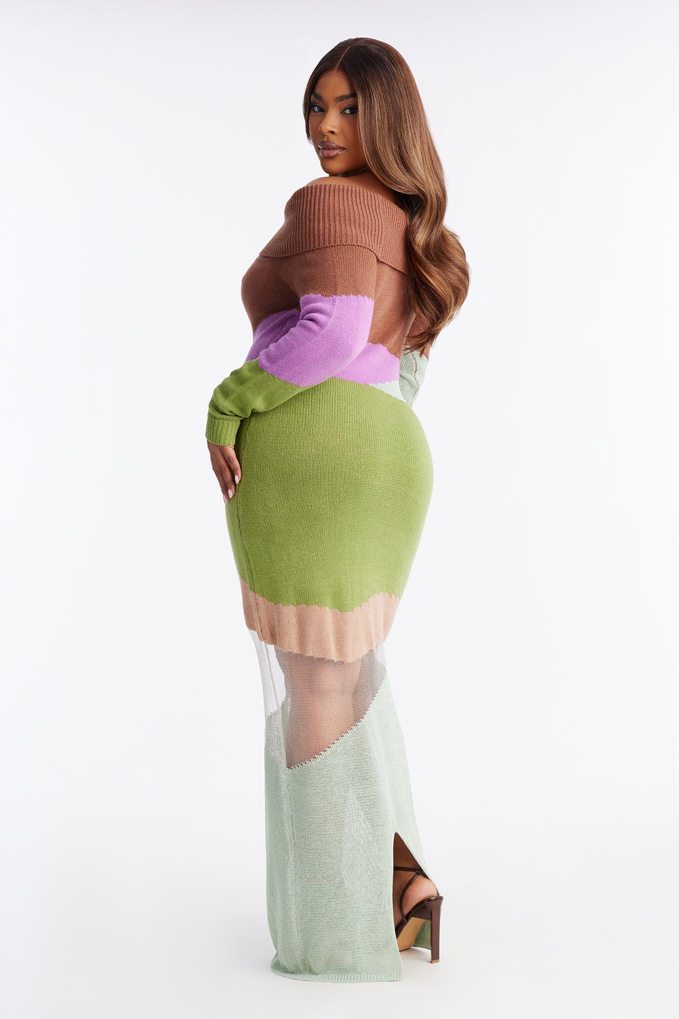 Available In Green/combo. Sweater Maxi Dress Long Sleeve Off Shoulder Neckline Sheer Cut Out Stretch Self : 75% Acrylic 15% Nylon 10% Polyester Imported