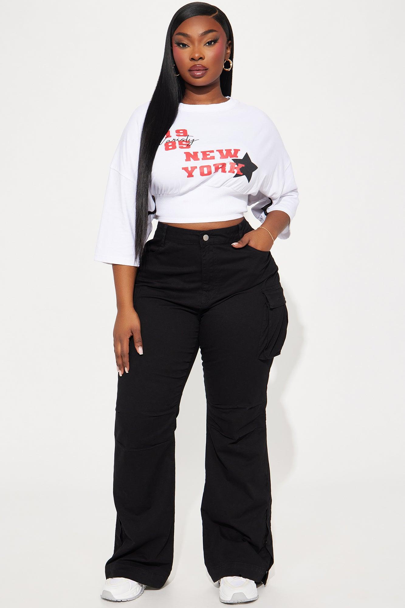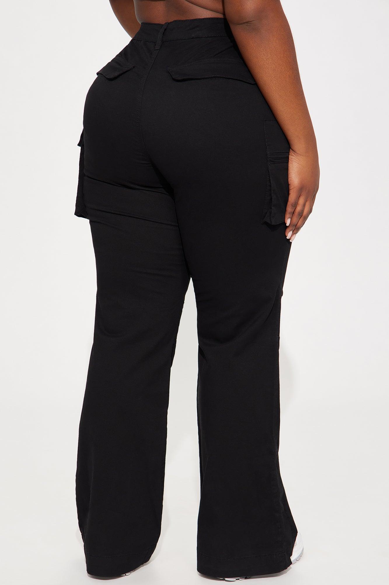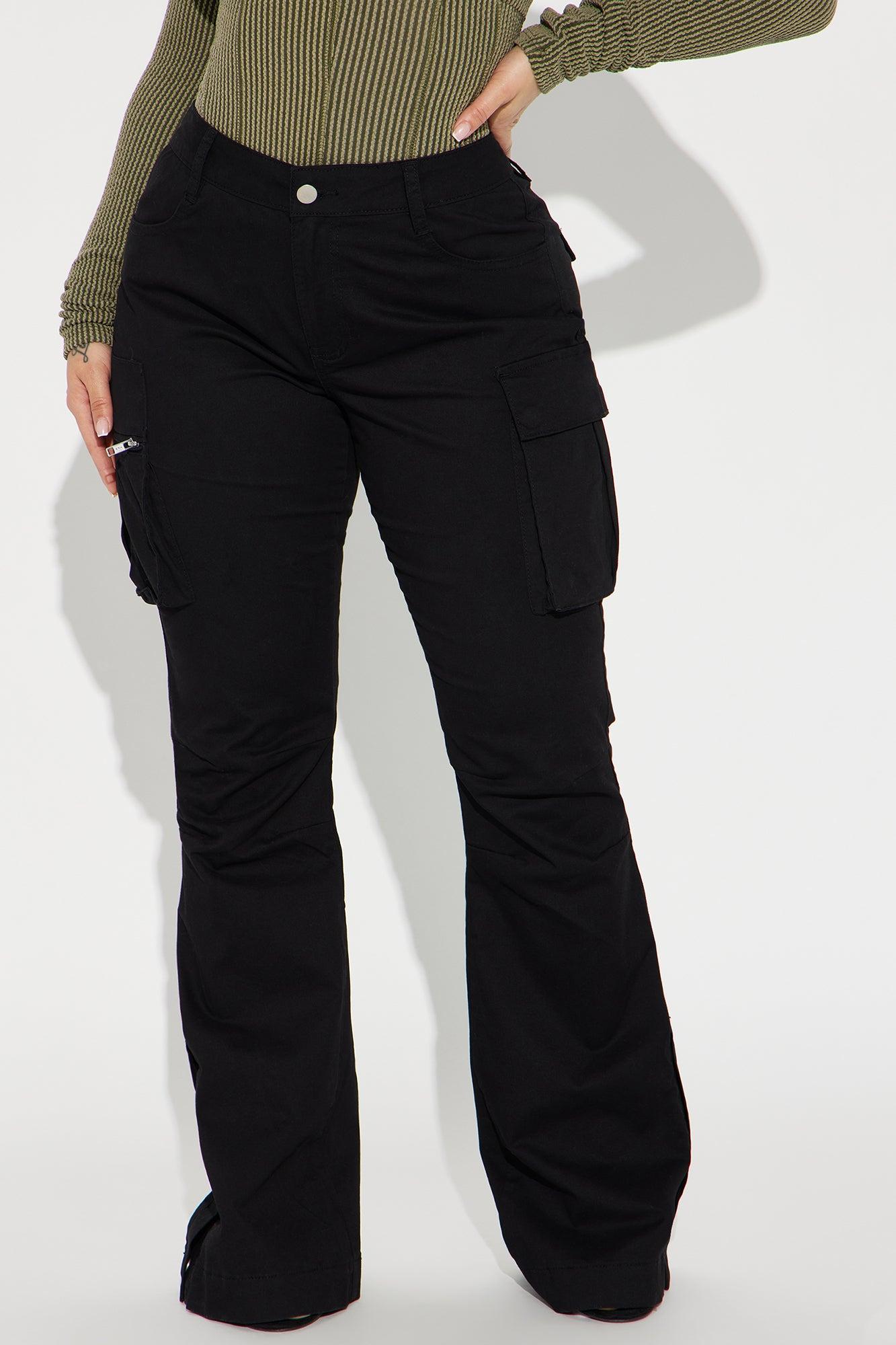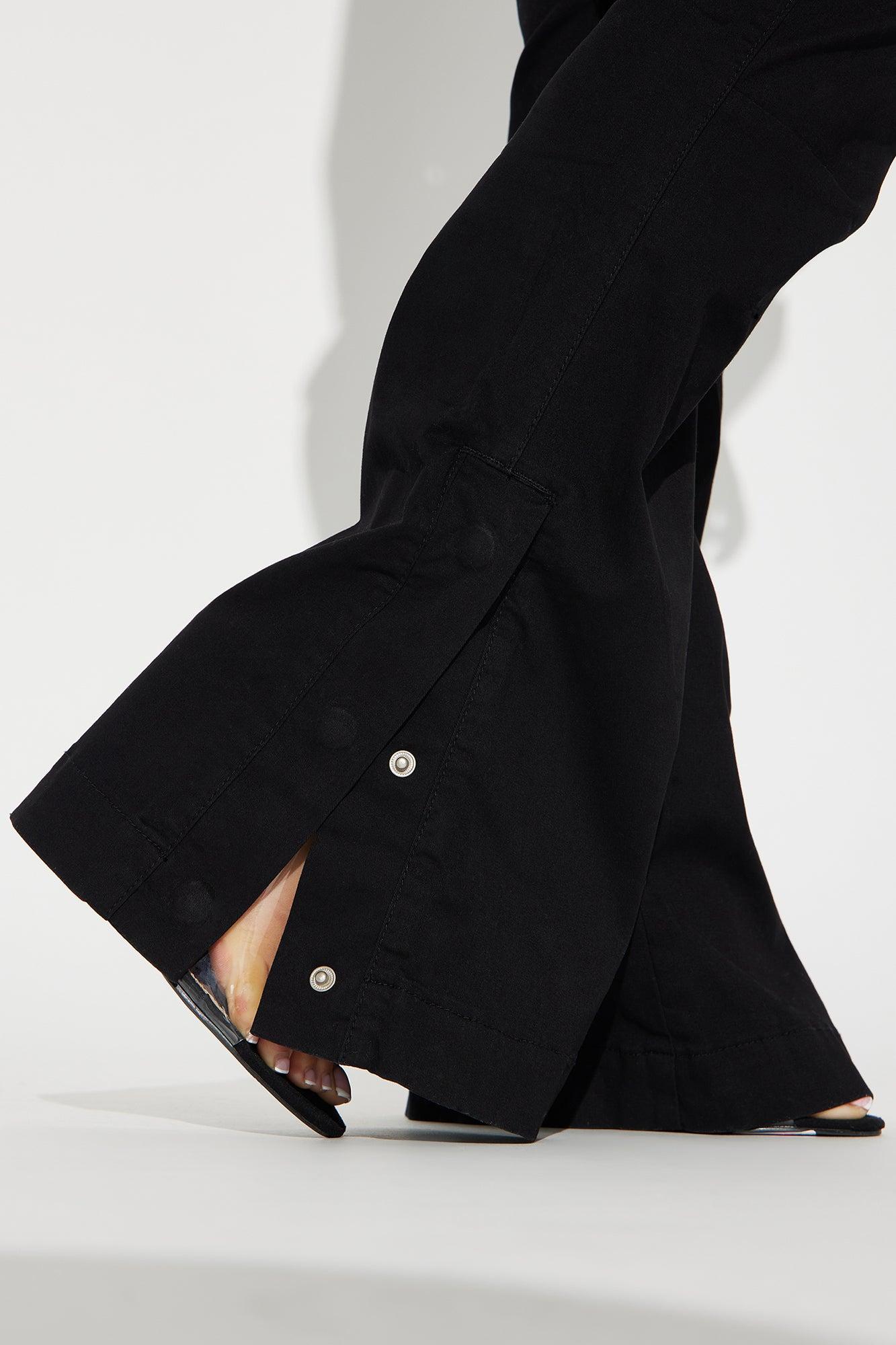 Available In White And Black. Flare Pant Low Rise Button & Zip Closure Cargo Pockets Hidden Side Button at Hem Non Stretch 97% Cotton 3% Spandex Imported California Proposition 65 WARNING: Cancer and Reproductive Harm - www.P65Warnings.ca.gov.