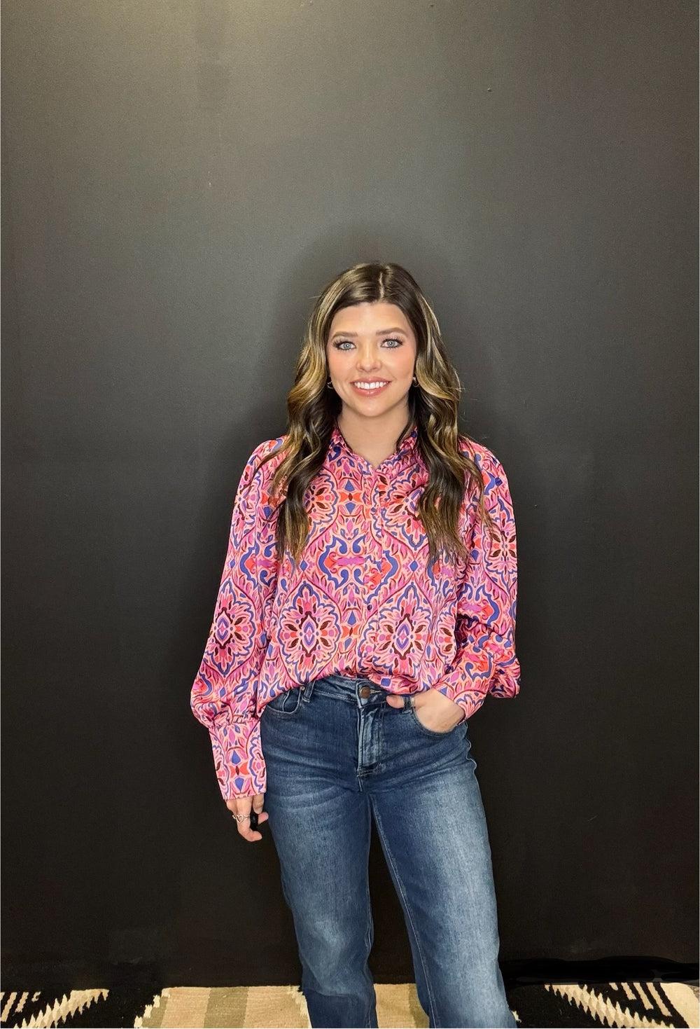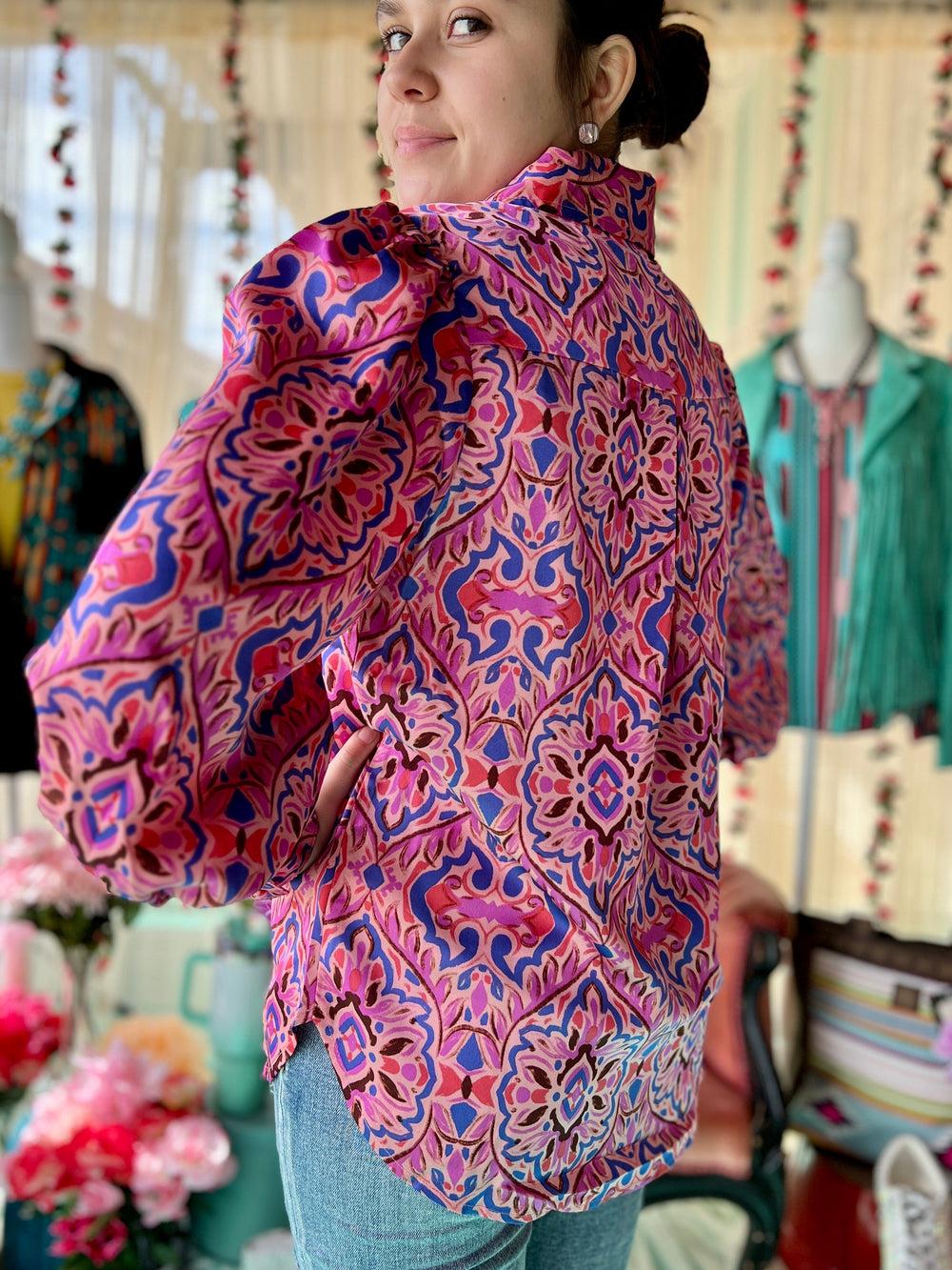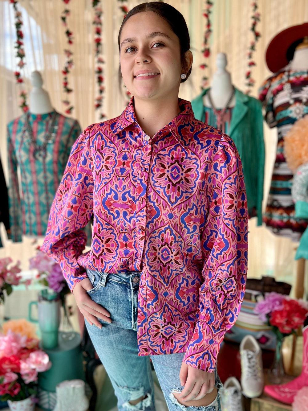 Effortlessly chic, the She's All Business Top is perfect for the stylish professional. The collar, paisley print, puffed shoulders, and lightweight satin material add a playful touch to this classic button-up. In shades of pink and purple, it's a true must-have for any wardrobe. (Extra points for rocking a power pose in this top.)