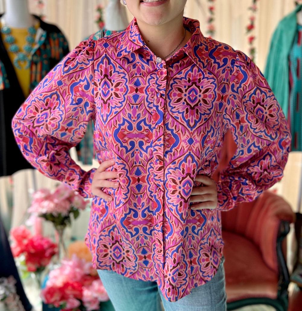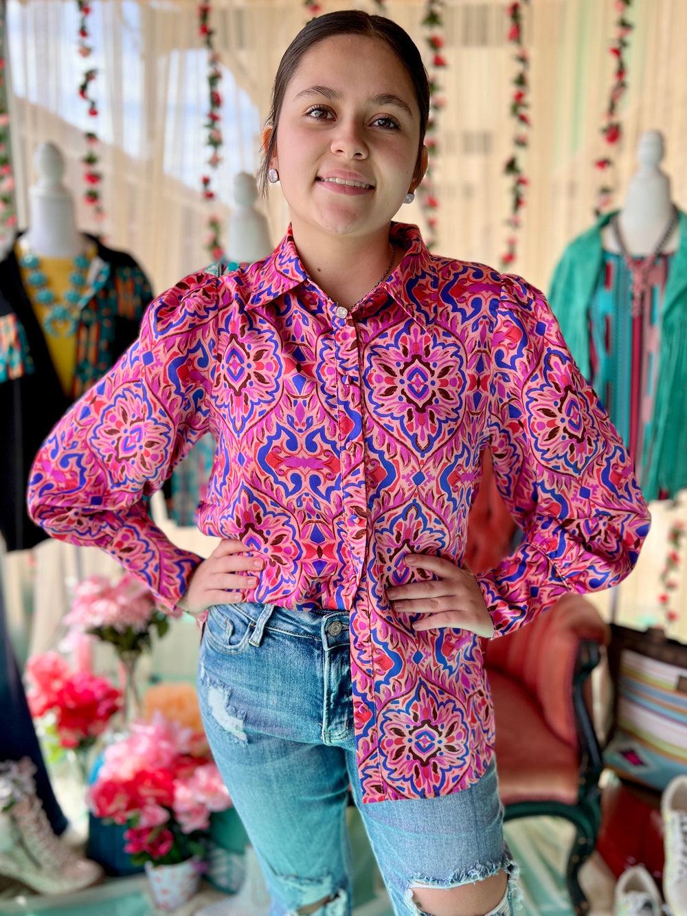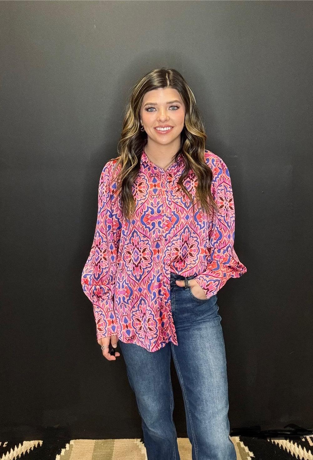 Effortlessly chic, the She's All Business Top is perfect for the stylish professional. The collar, paisley print, puffed shoulders, and lightweight satin material add a playful touch to this classic button-up. In shades of pink and purple, it's a true must-have for any wardrobe. (Extra points for rocking a power pose in this top.)