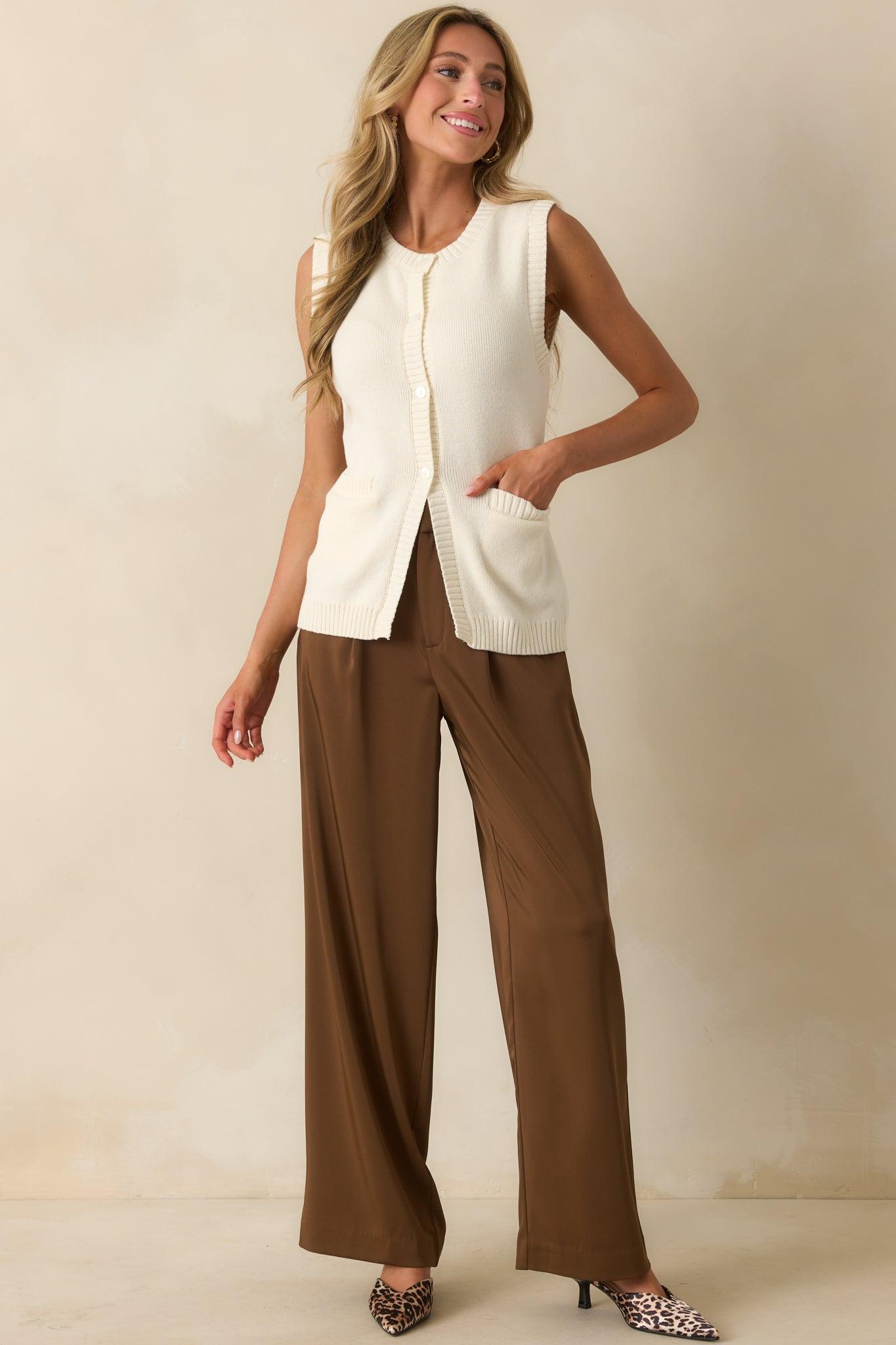 The She’s Still Got It Ivory Button Up Knit Sweater Vest brings a confident, timeless energy, the kind of piece that proves some styles never lose their charm and always know how to make an outfit feel complete. This ivory sweater vest features a soft knit fabric, a crew neckline, a functional button front placket, ribbed hemlines, functional front patch pockets, and a straight hem. 60% Cotton & 40% Acrylic Unlined Hand Wash Cold Manufactured in China Designed in The USA Model is 5'8" and is Wearing a Size Small