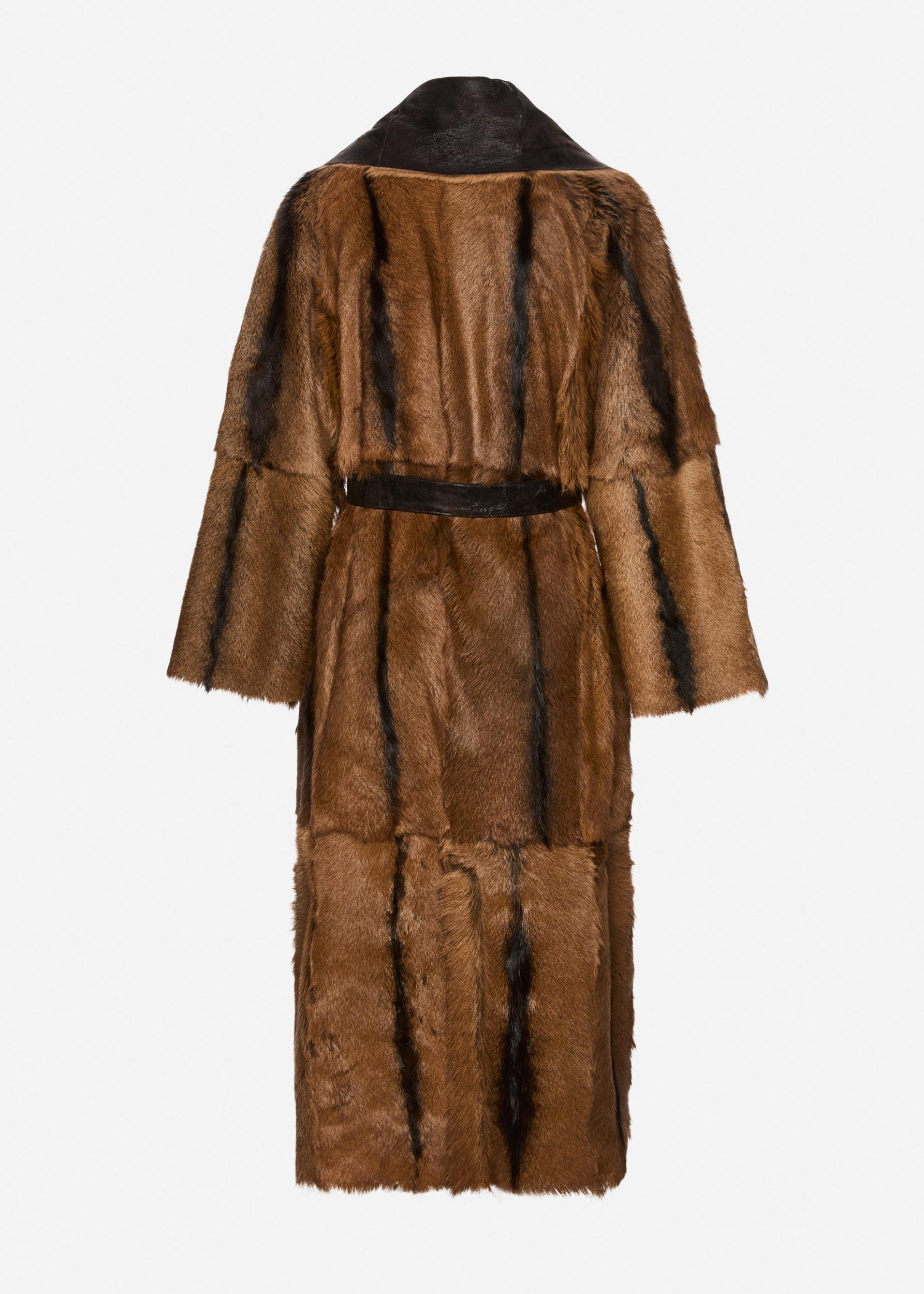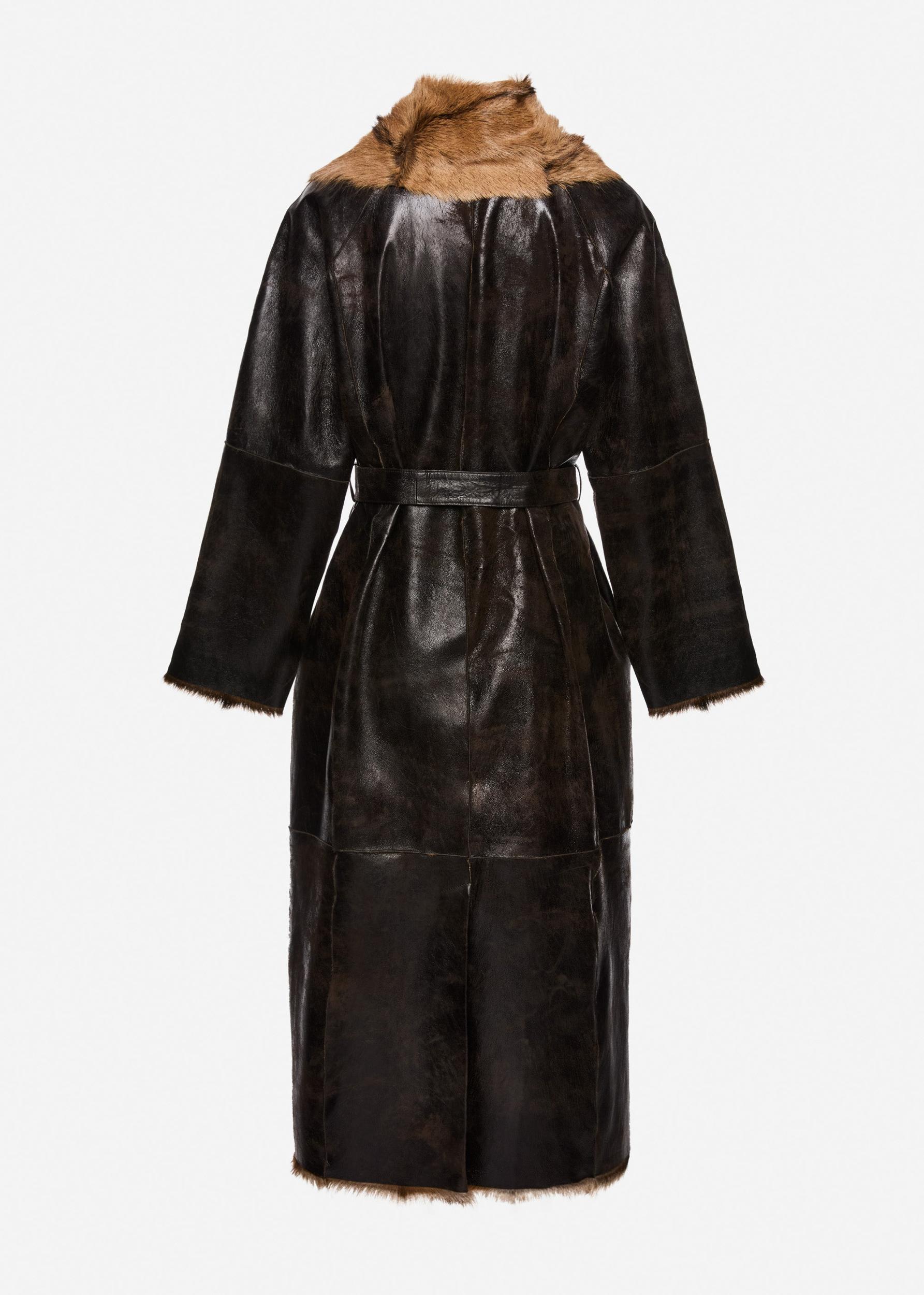 A full-length shearling coat crafted from rich brown leather with a soft cream interior. The sculptural silhouette features a dramatic shawl collar lined with plush curly shearling, extending through the lapel and hem for a bold contrast in texture. Designed with a matching leather belt to cinch the waist.