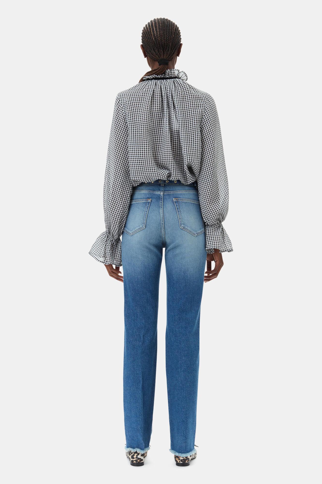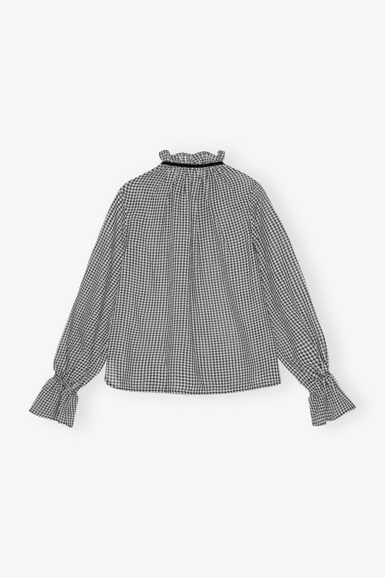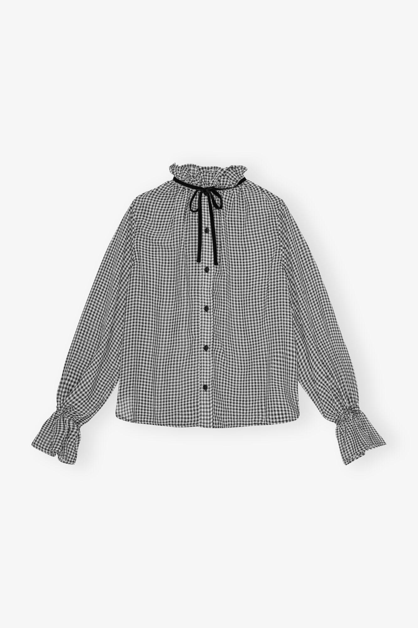 This black and white Sheer Check Tie String Shirt features a high ruffle collar with a black tie detail at the neckline. The shirt has a button-up front and long balloon sleeves that gather at the ruffled cuffs for added volume.