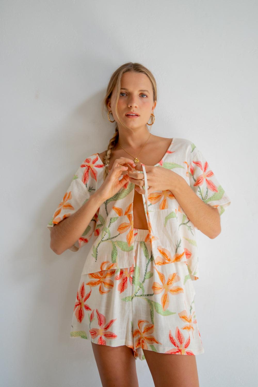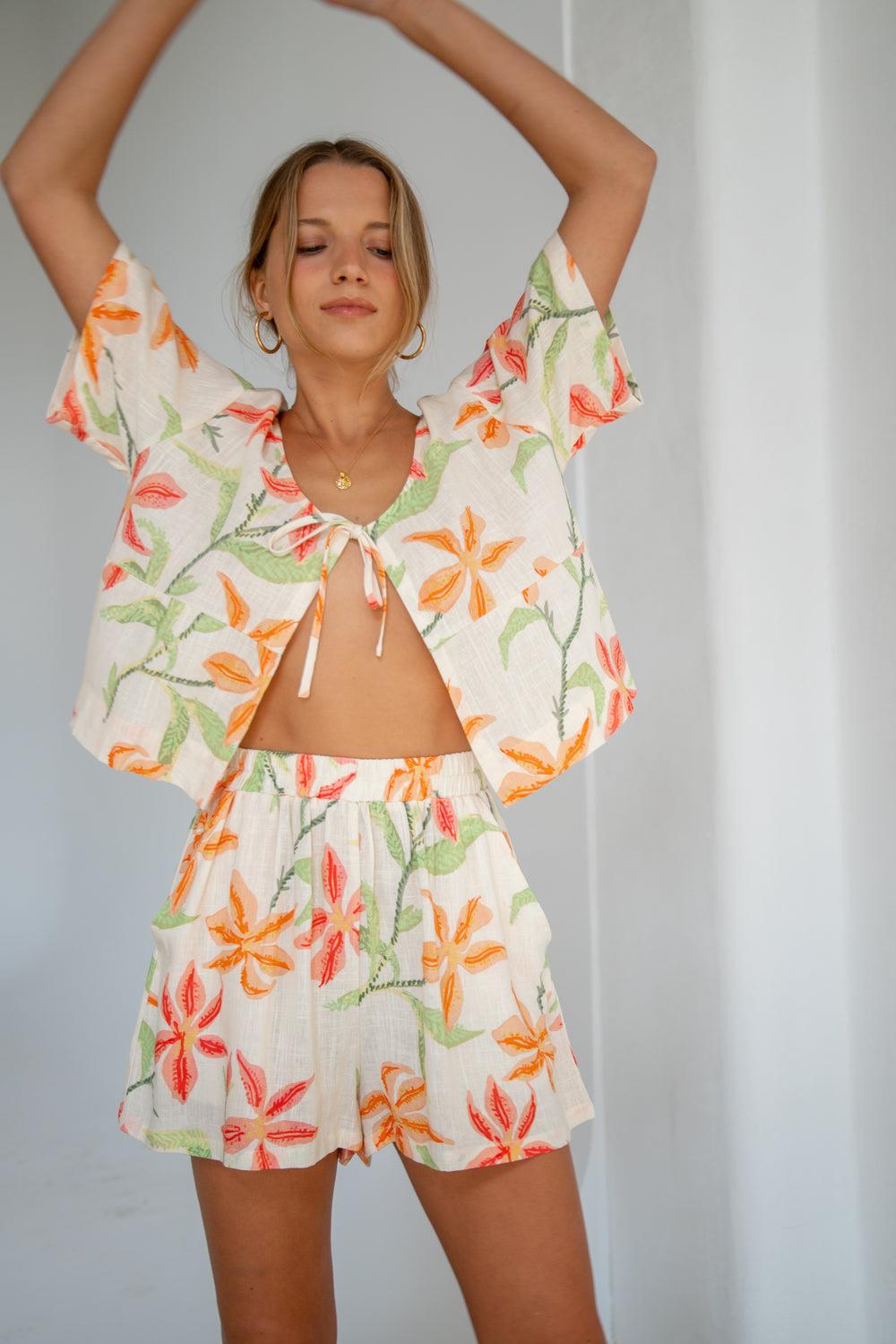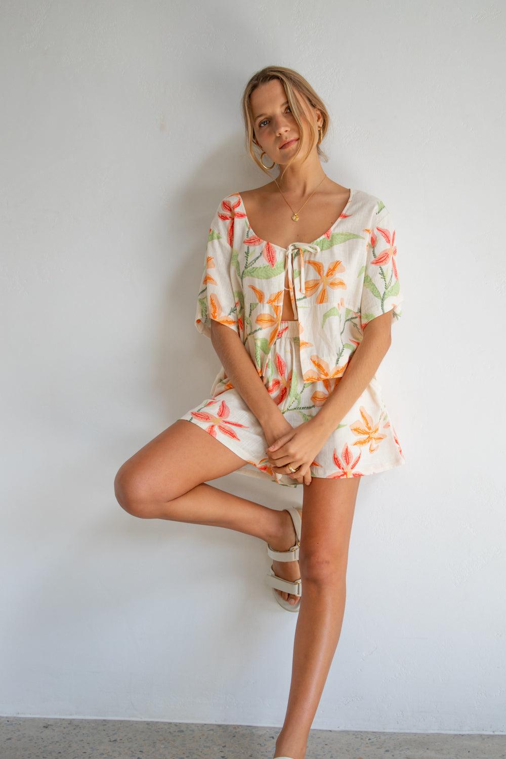 Stylist's Tips The floral shorts you've been looking for. Wear these shorts with its matching smock top to complete your tropical holiday look or a crisp white tank for an off duty casual look. Designed by us, just for you: A VRG GRL Exclusive. Details Elastic waist Side pockets Because this is a light coloured fabric, we recommend wearing this with nude undergarments 70% Cotton / 30% Linen Cold Hand Wash / Cool Iron Shipping & Delivery For all shipping details see here Size & Fit Length 36cm / 14in (taken from a size AU 8 waist to hem) Runs true to size - Please refer to our VRG GRL size guide Model Info Model wears size AU 8 Model height 165cm / 5ft 4in