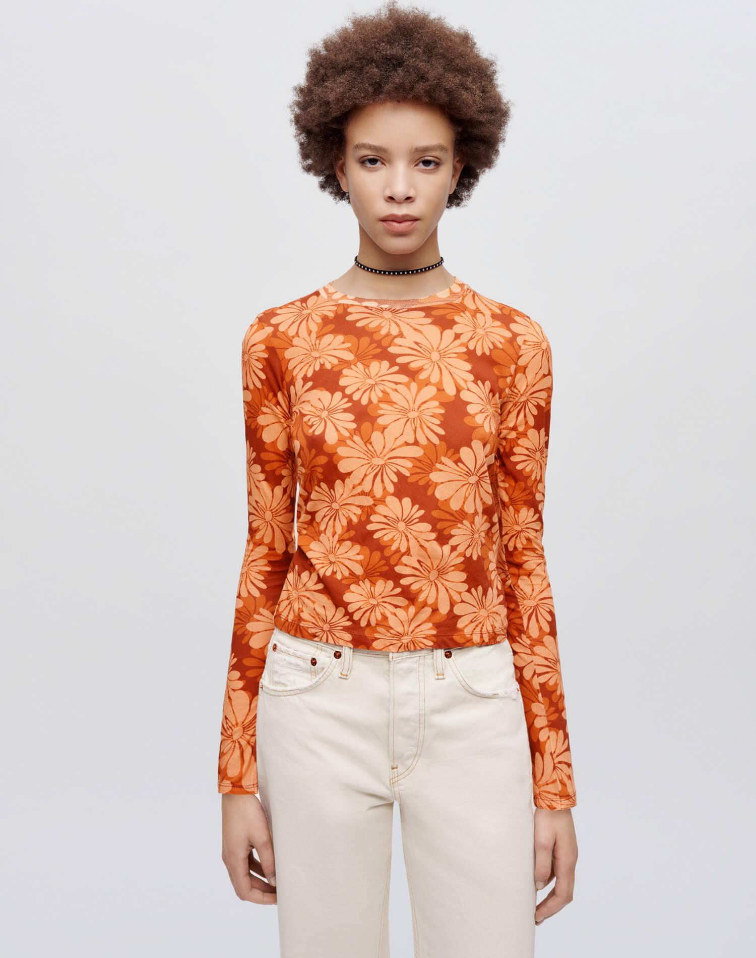 The Sheer Long Sleeve in Retro Daisy is a fun, printed spin on our new basic. Made from our new lightweight, semi sheer jersey this tee is great for layering and can easily go from day to night
