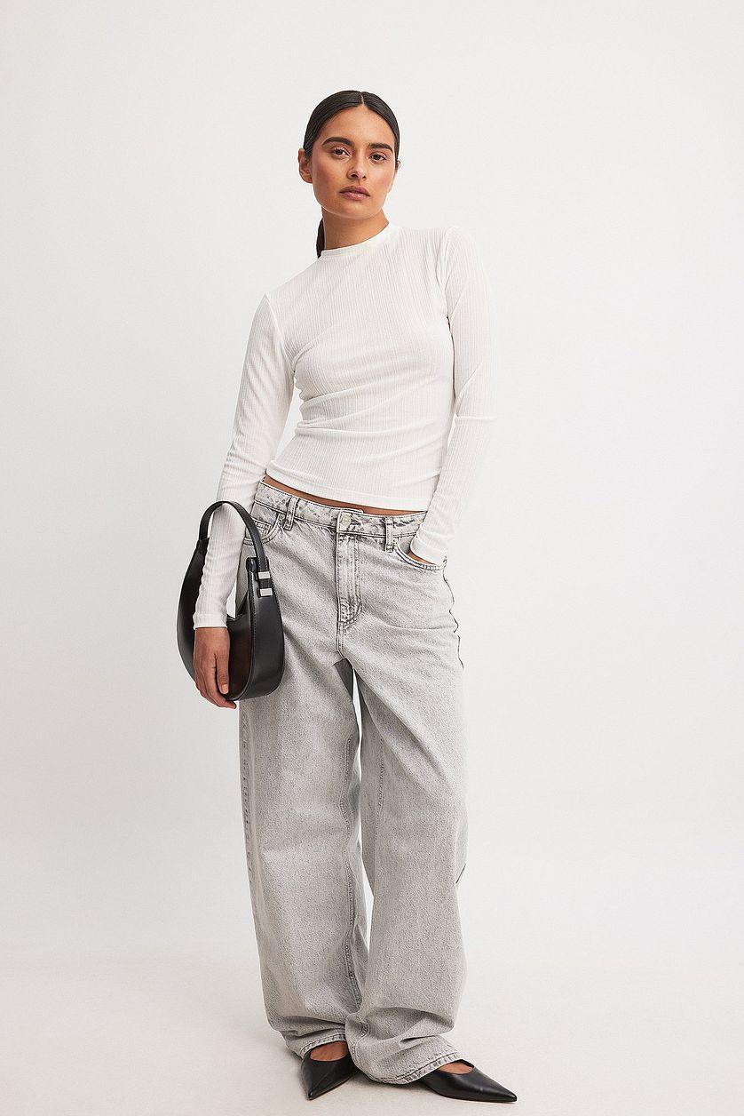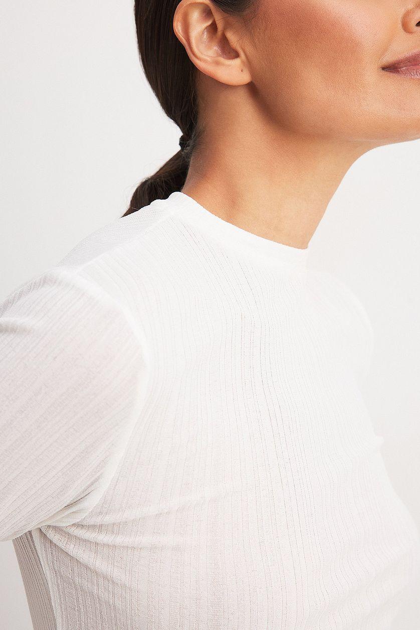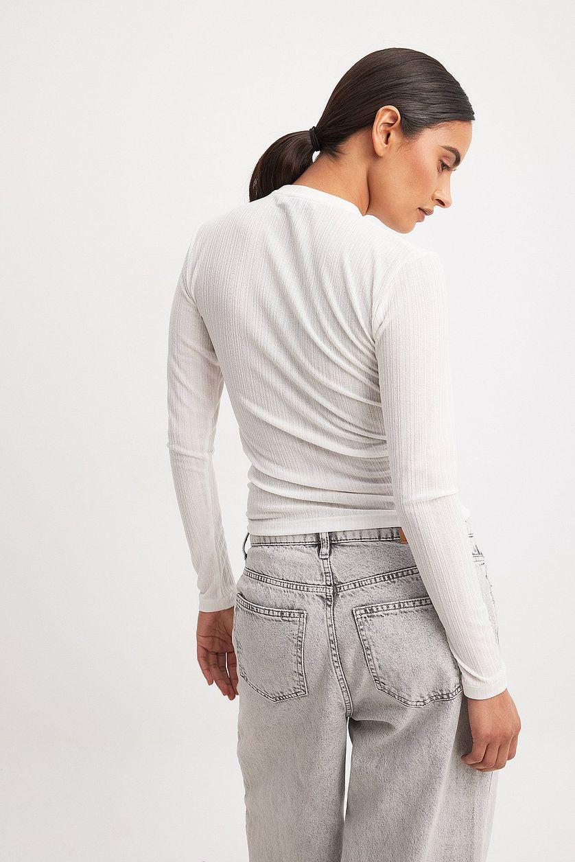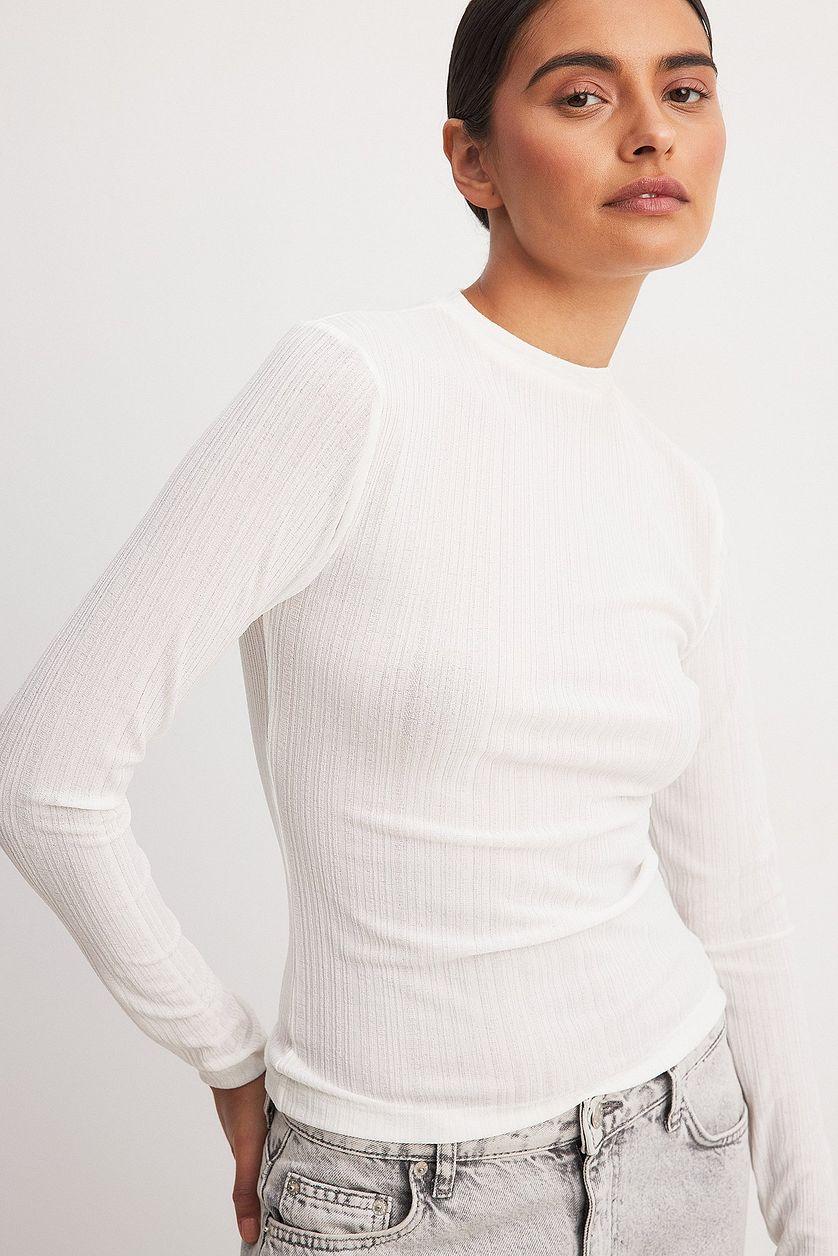 This long sleeve top features a relaxed fit and a sheer, ribbed stretchy material. It has a round neck.