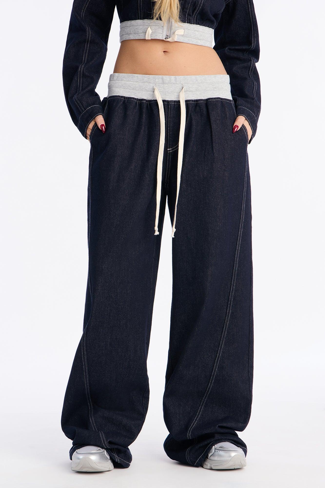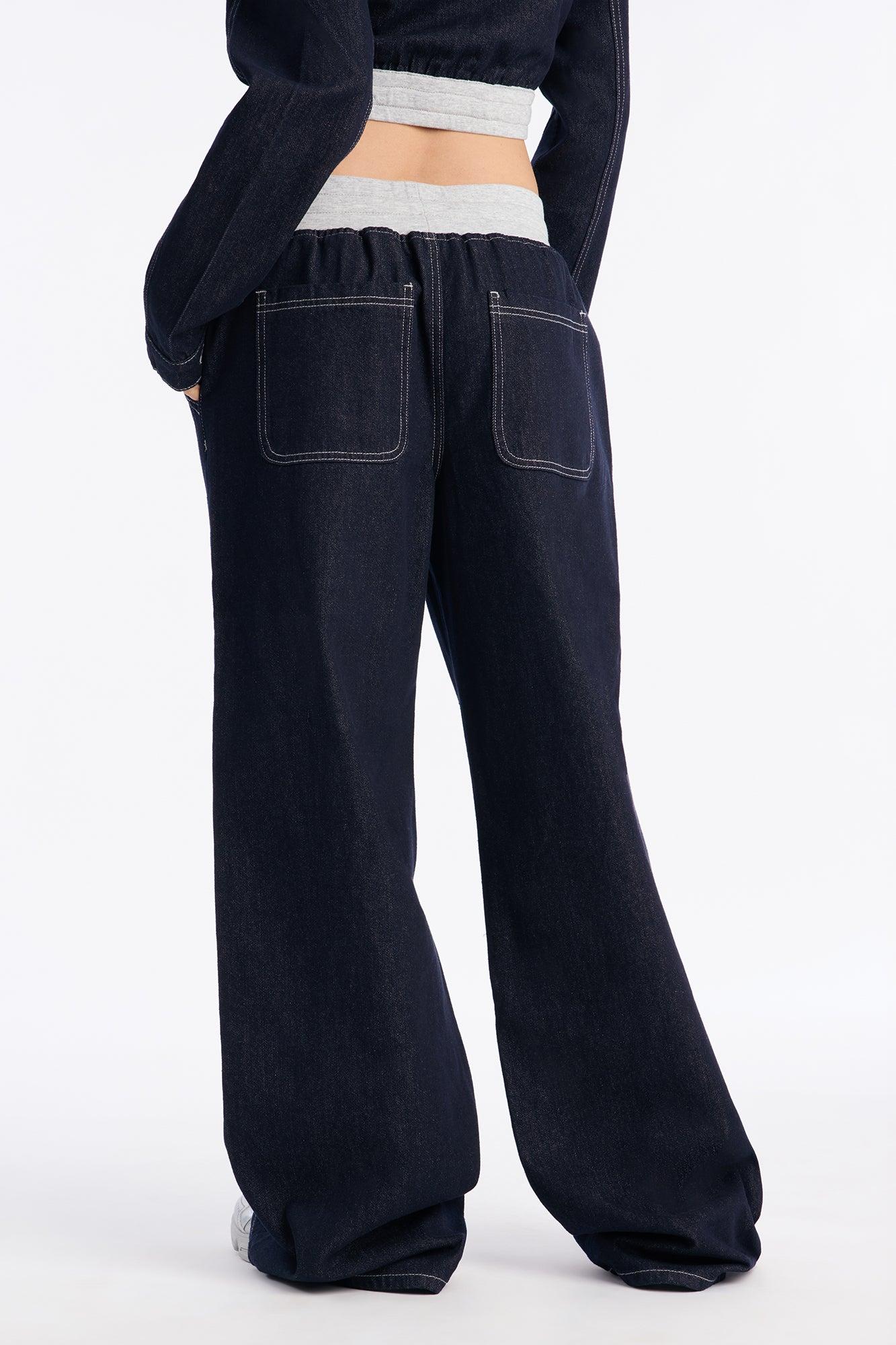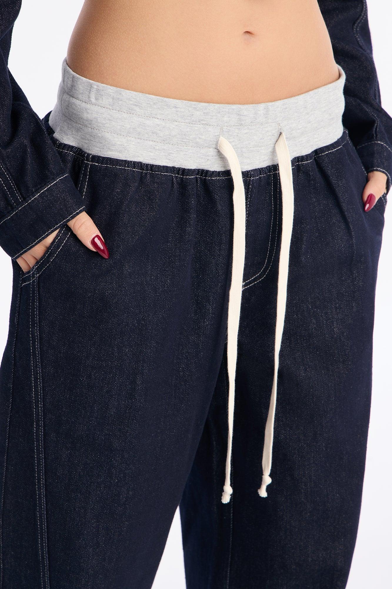 Available In Dark Denim. Wide Leg Jean Pair With Sheffield Hooded Denim Jacket To Complete The Look! 4 Pocket Drawstring Waist Knit Fabric Mix 11.5" High Rise 34" Inseam Disclaimer: Due To The Specialized Wash Process, Each Garment Is Unique. Self: 79% Cotton 21% Polyester Contrast: 96% Polyester 4% Spandex Imported California Proposition 65WARNING: Cancer and Reproductive Harm - www.P65Warnings.ca.gov.