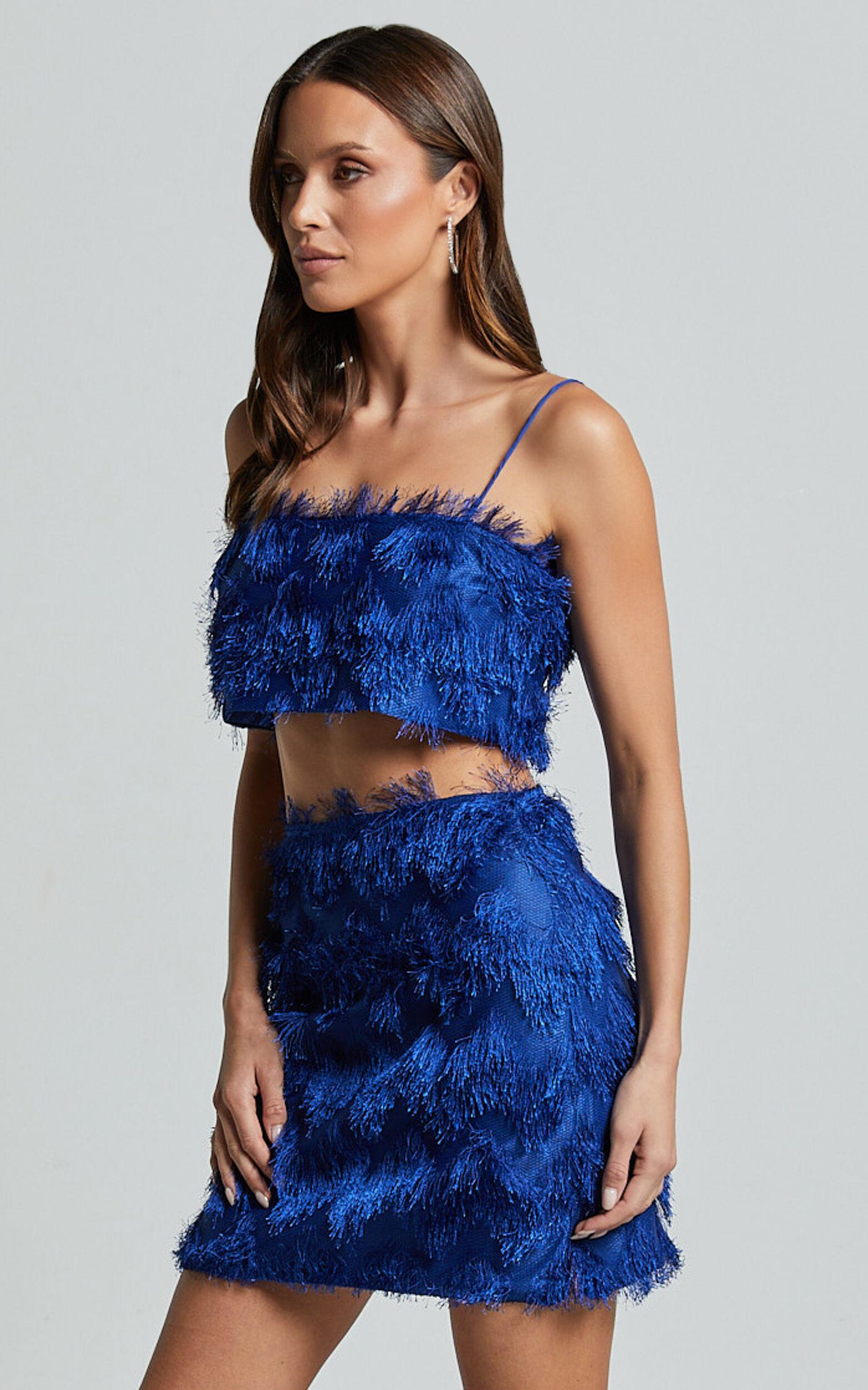 Get ready to turn heads on your next night out with the Shelby Top - Strappy Fringe Crop Top in Cobalt Blue. With its eye-catching cobalt blue color and playful fringe details, this top is guaranteed to make a statement wherever you go. Made from high-quality polyester, this sleeveless crop top offers a comfortable fit that flatters all body types. Whether you're hitting the dance floor or attending a party night with friends, the Shelby Top will have you feeling confident and empowered. Pair it with your favorite jeans or skirt for a straight-up stylish look that's perfect for any occasion. Shop now and get ready to be the life of the party!Product Details:Pull on styleFashion TopsFringing fabricStraight necklineParty Night readyCrop lengthSleeveless designPolyester materialSize and FitSize S / 8 length: 19cm / 7.48inMaterial and CareMain Fabric: 100% PolyesterMedium Stretch
