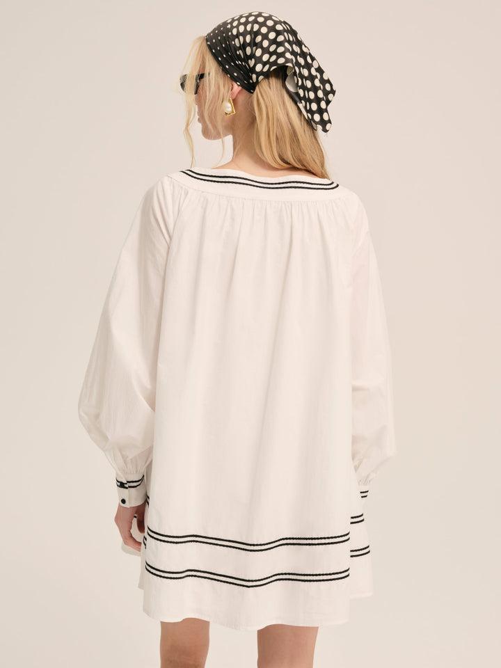 Inspired by nostalgic ’50’s silhouettes, the Shelly babydoll mini dress exudes vintage charm. This cotton long sleeve mini dress features charming contrast striped piping throughout, center-front buttons, a gathered bodice and sleeves, and a contrast decorative bow at neckline.