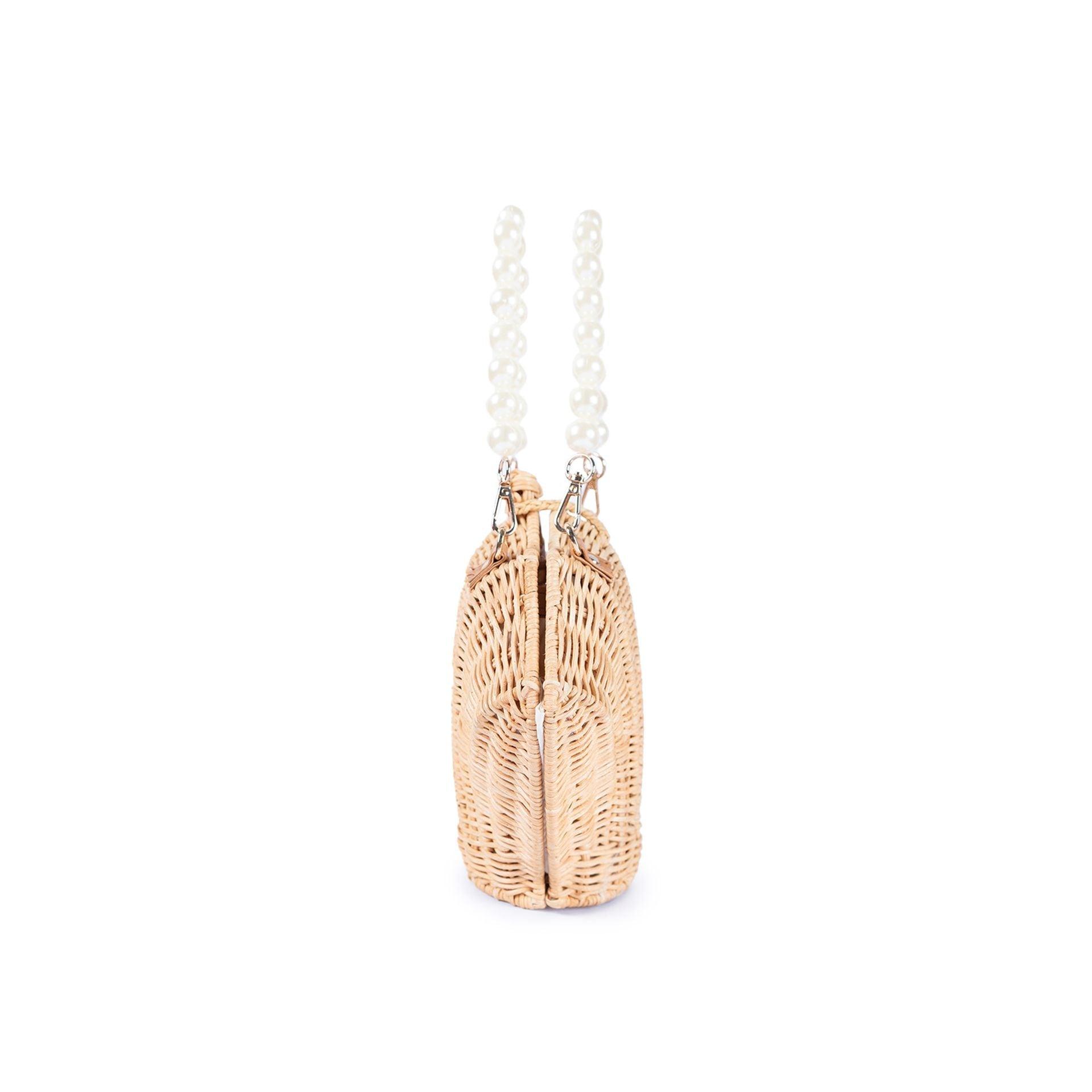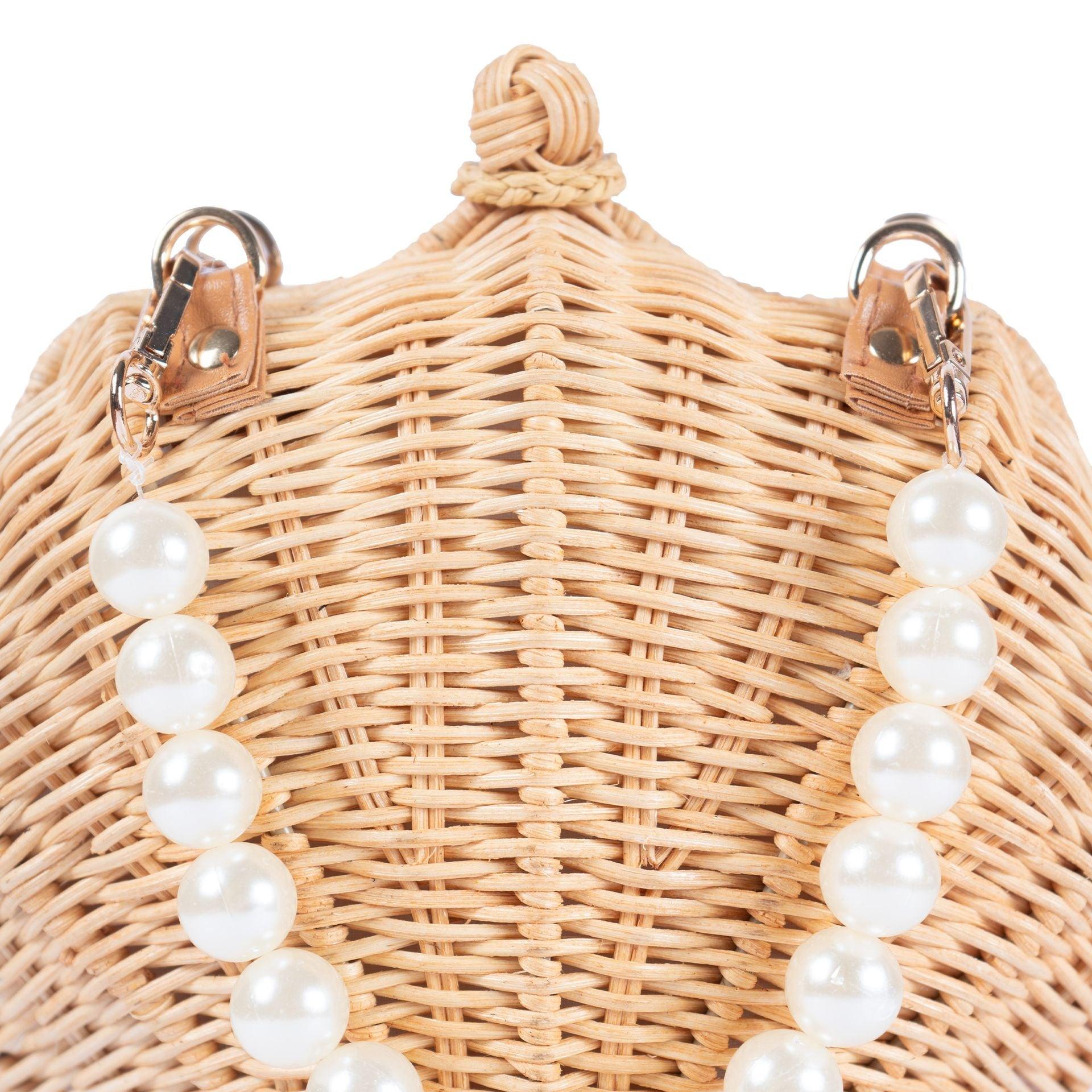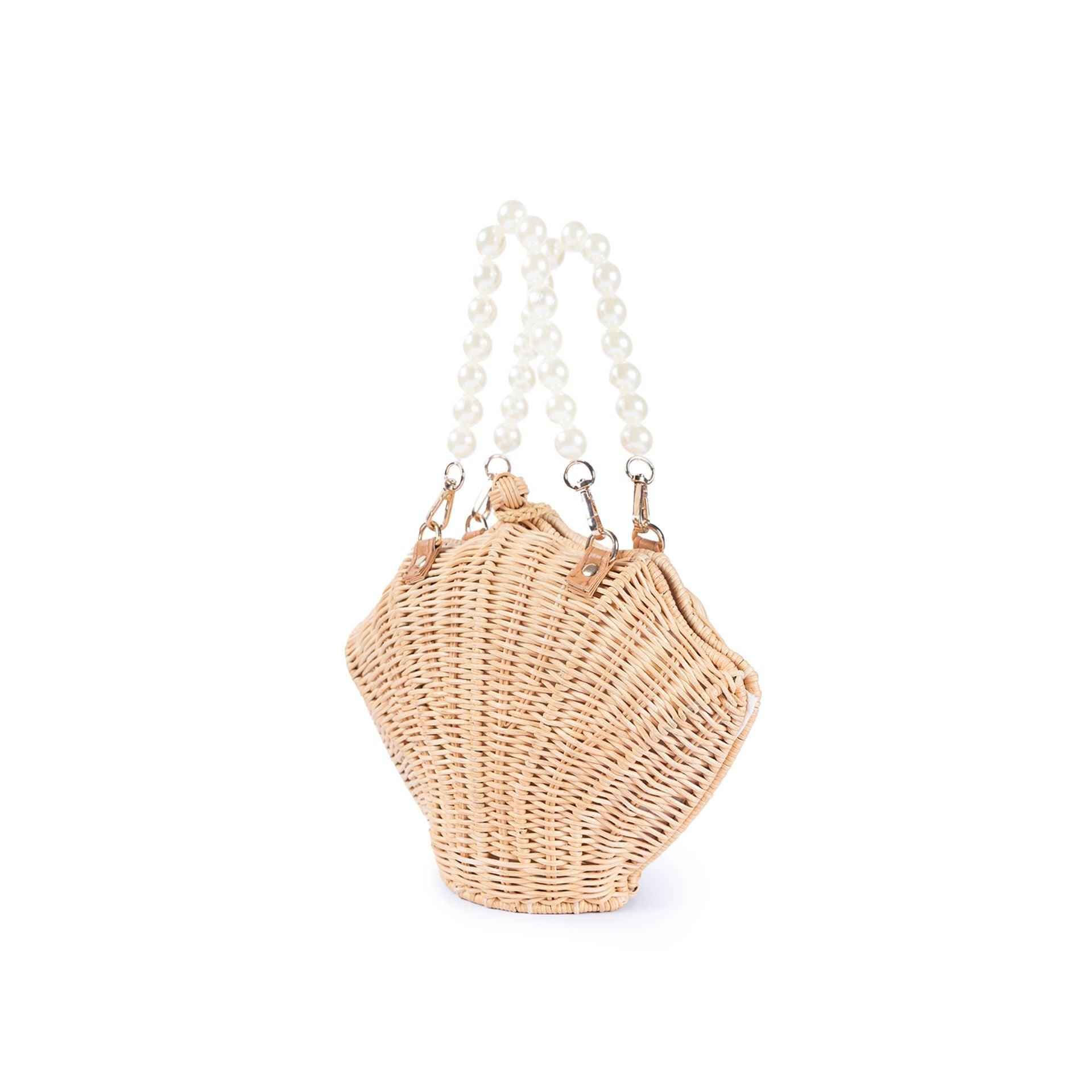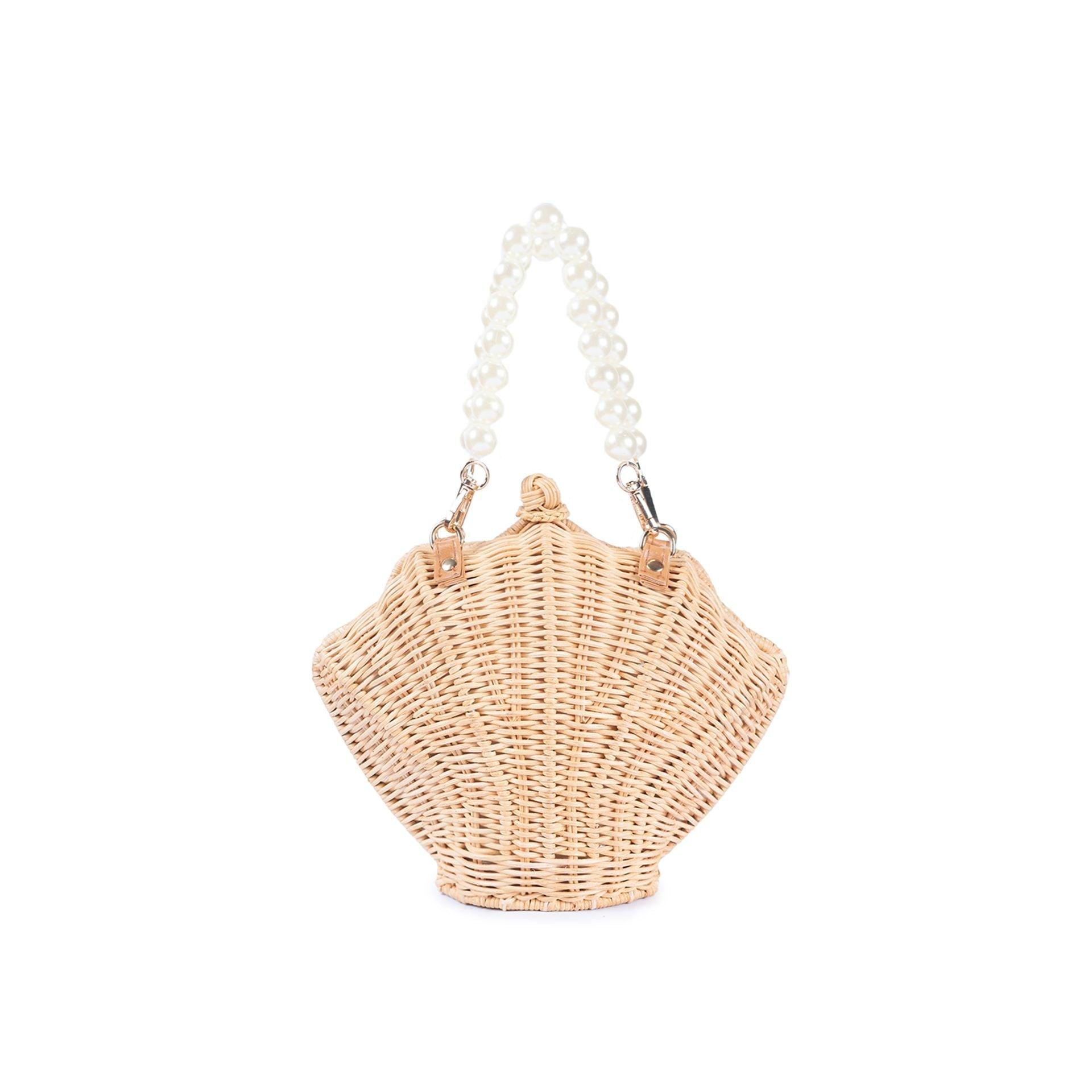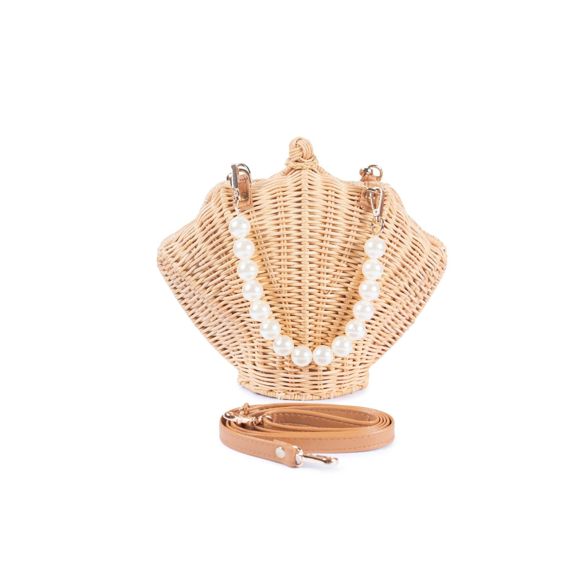 The Shelly Pearl si a charming seashell-shaped rattan bag, perfect for making a statement. The structured design mirrors the natural beauty of a shell, while the standout feature is the luxurious pearl strap, adding a touch of elegance and sophistication. The pearls give the bag a glamorous yetplayful vibe, making ti an excellent accessory for both casual outings and more dressed-up occasions. The bag also includes a crossbody strap, offering versatility in how ti can be worn. It's an ideal blend of nature-inspired design with a chic,refined touch.