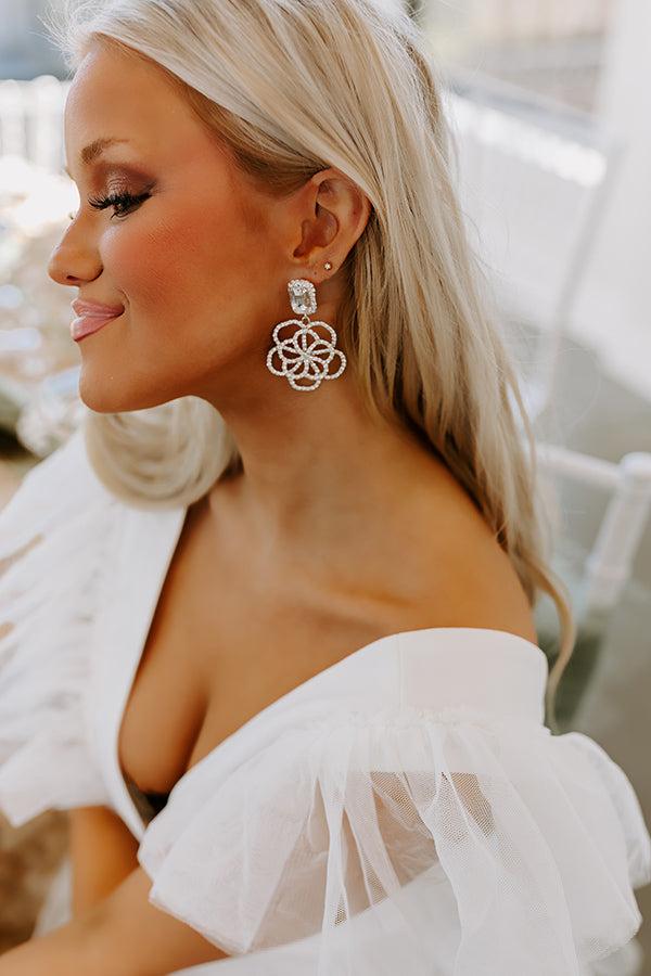 - Shimmer the night away with these gorgeous earrings! - Rhinestone studs with a dangling floral drop design - Length: 3 inches