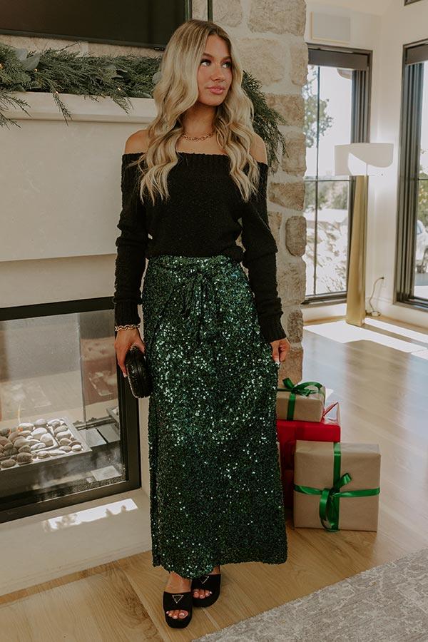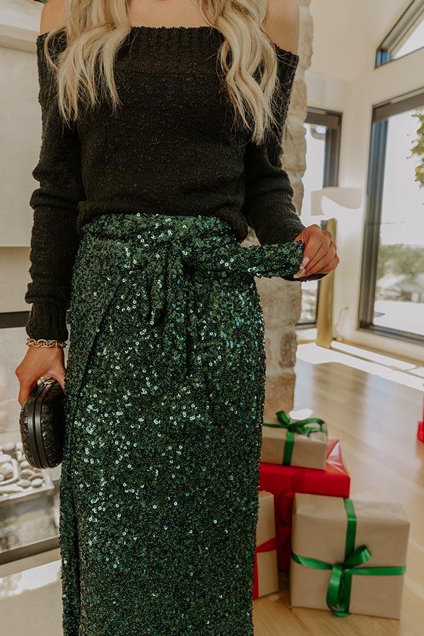Shimmering Smile High Waist Sequin Wrap Maxi Skirt in Hunter Green