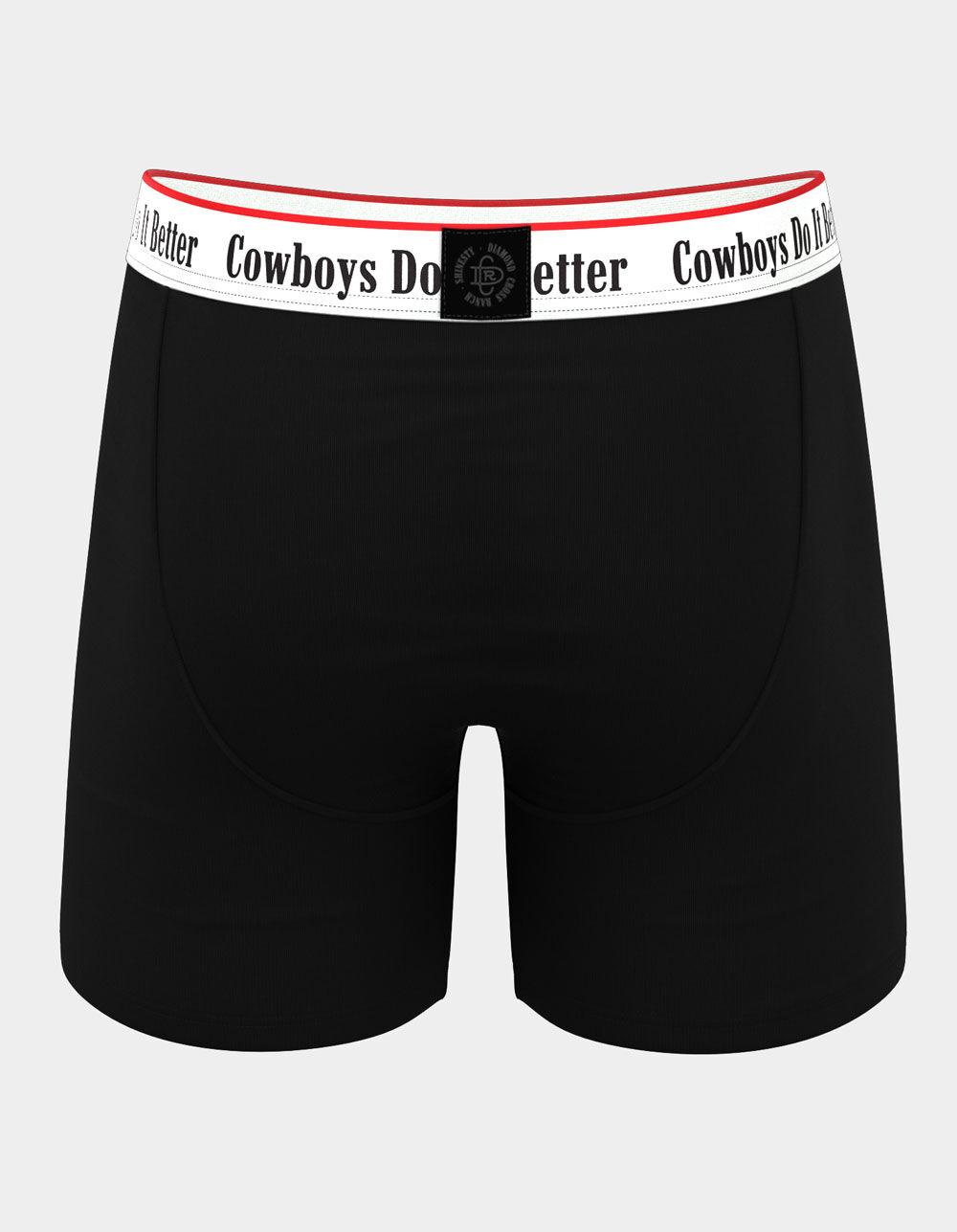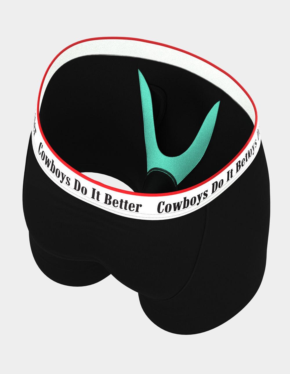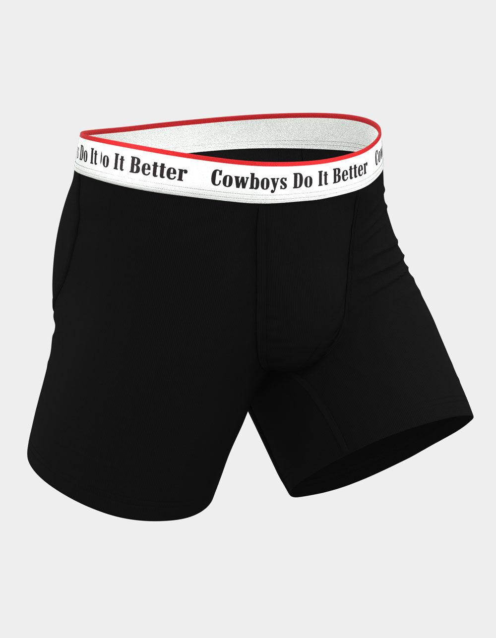 Shinesty The Cowboys Do It Better Boxer Briefs. Supportive and enhancing Ball Hammock® technology pouch keeps the goods off your legs and out of the grundel. Moisture wicking and breathable so you stay fresh all day. Anti-bunching, no-itch stitching, 4-way stretch. 6” inseam. Approximate outseam: 11". 95% Modal 5% Spandex. Machine wash. Imported. Sizes: S: 28-31 M: 32-35 L: 36-39 XL: 40-44