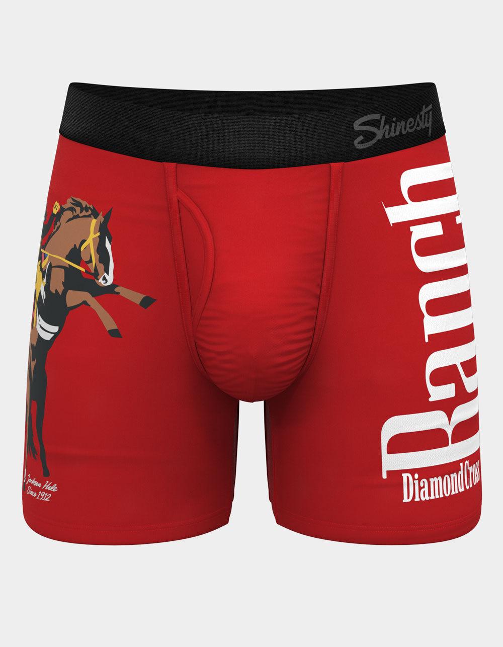 Shinesty x Diamond Cross Ranch The King Of Wyoming Boxer Briefs. Supportive and enhancing Ball Hammock® technology pouch keeps the goods off your legs and out of the grundel. Moisture wicking and breathable so you stay fresh all day. Anti-bunching, no-itch stitching, 4-way stretch. 6” inseam. Approximate outseam: 11". 95% Modal 5% Spandex. Machine wash. Imported. Sizes: S: 28-31 M: 32-35 L: 36-39 XL: 40-44