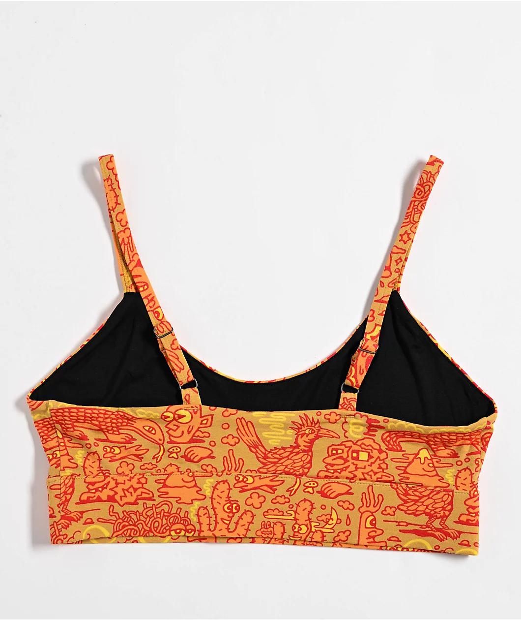 Arriving from the Shinesty and Killer Acid collaboration, the Desert Drop bralette is the perfect addition to your closet. A sublimated pattern throughout showcases cartoon art of Desert plants and animals in an orange color scheme for a hot summer v