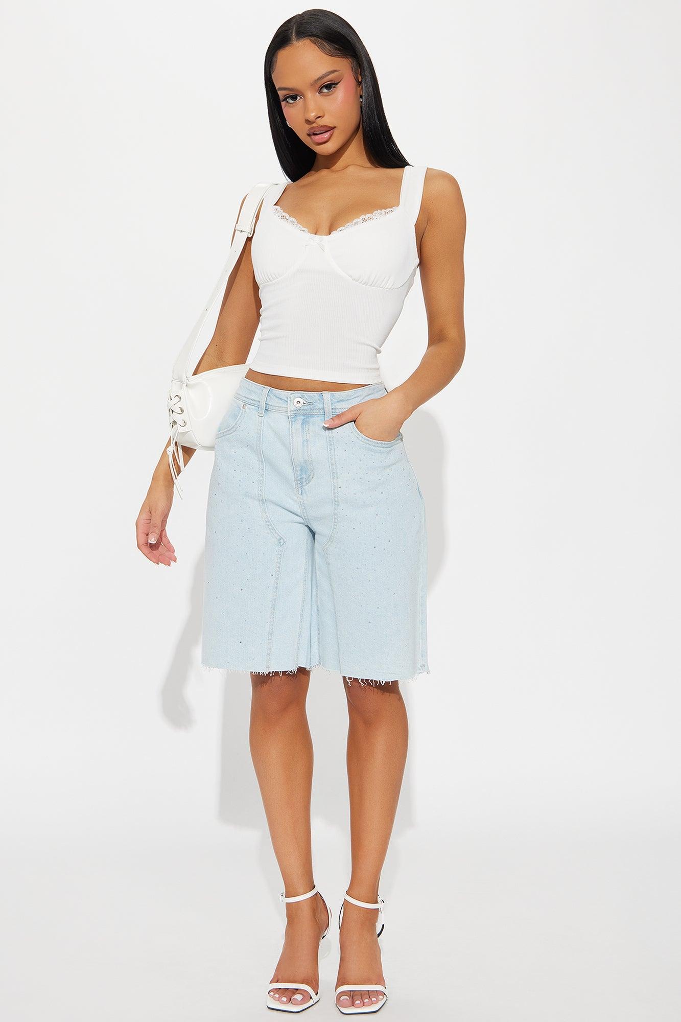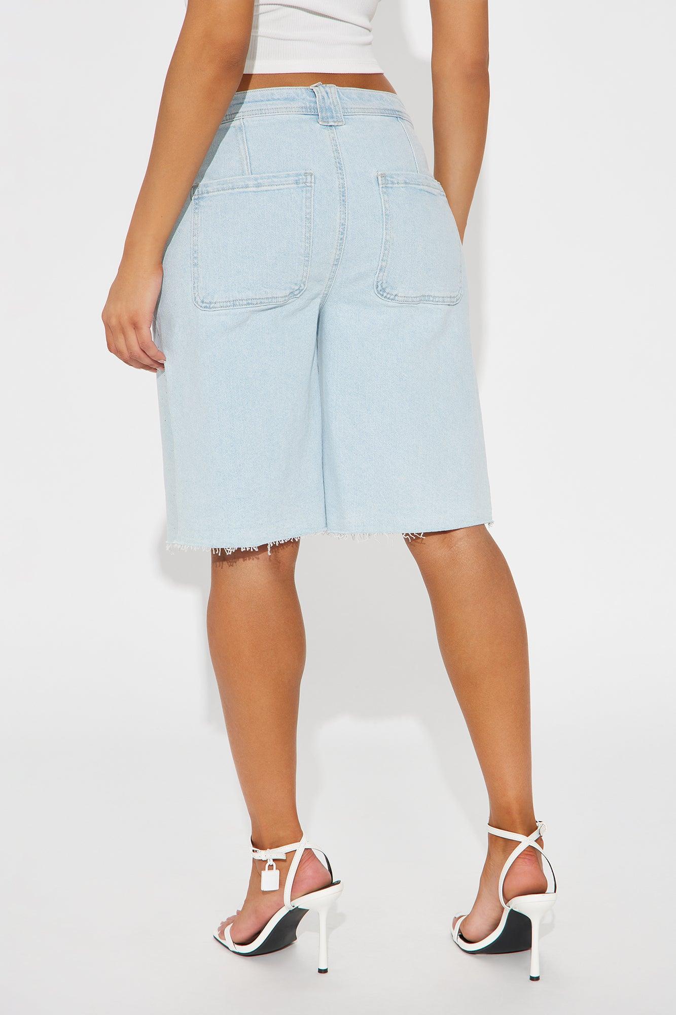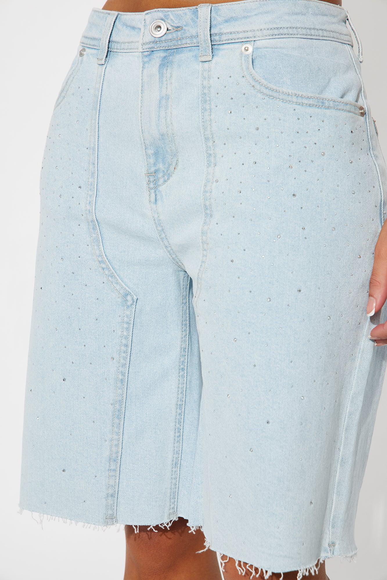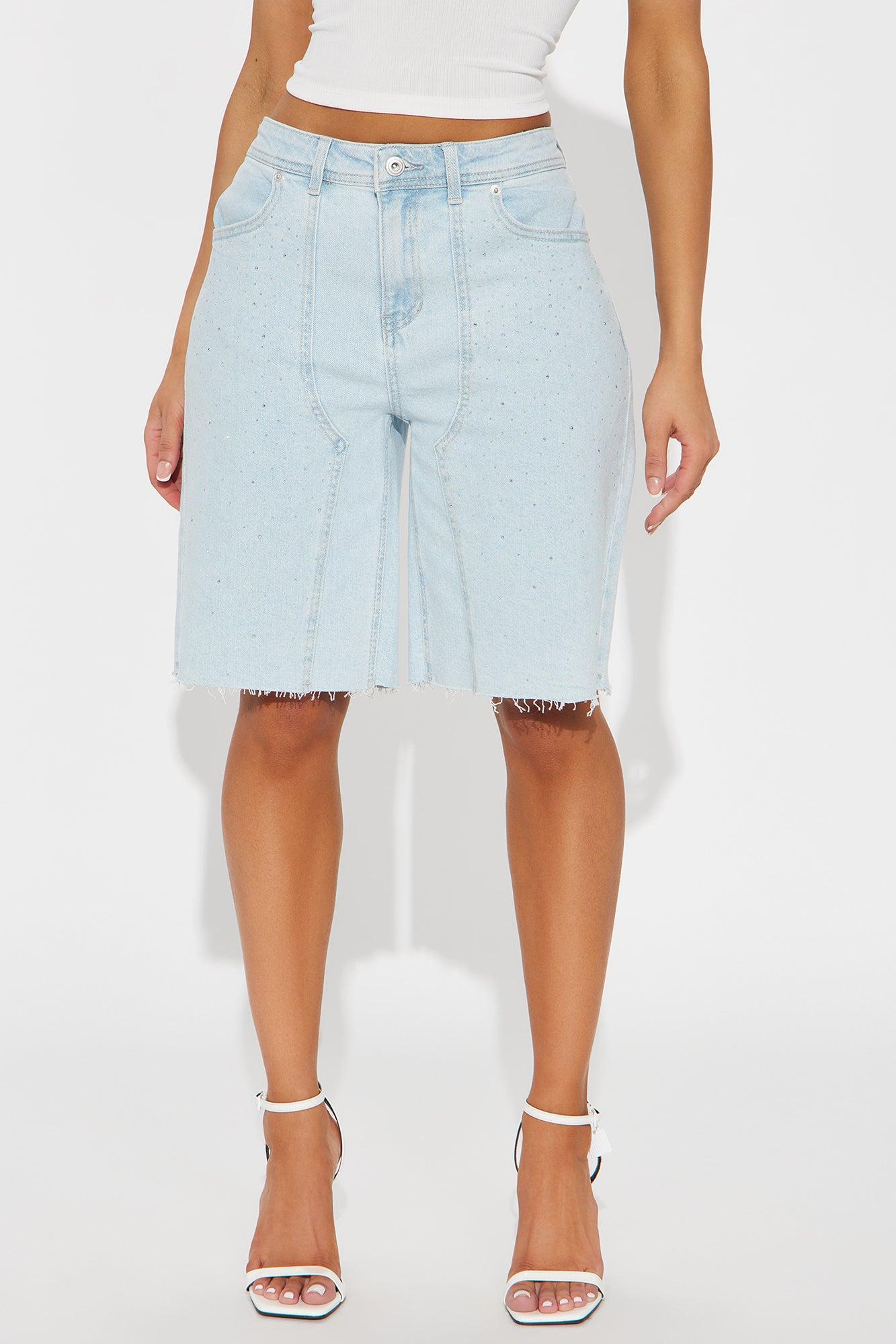 Available In Light Wash. Denim Short Pockets Raw Hem 11" High Rise 10" Inseam Embellished Disclaimer: Due To The Specialized Wash & Distressing Process, Each Garment Is Unique. 99% Cotton 1% Spandex Imported California Proposition 65 WARNING: Cancer and Reproductive Harm - www.P65Warnings.ca.gov.