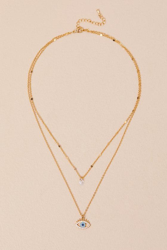 Everyone can see that you know how to accessorize thanks to pieces like the Lulus Shiny Sight Gold Chain Layered Necklace! Shiny, gold-toned metal shapes this trendy layered necklace that features two slender chains. The shortest chain features dainty medallion accents and a dangly clear rhinestone at the center, while the longer chain boasts a rhinestone-embellished, evil eye charm.